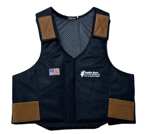 This pro rodeo protective vest has a tough Cordura outer shell and high-density foam and plastic inner shell. Leather pockets and trim with Velcro® adjustments. Black with Saddle Barn