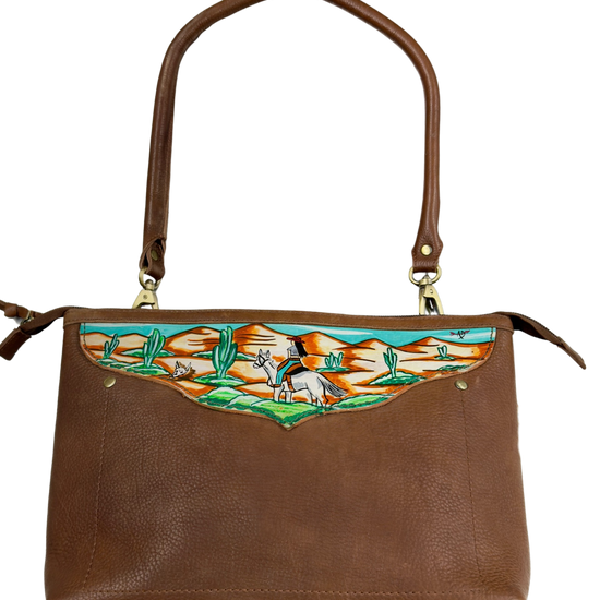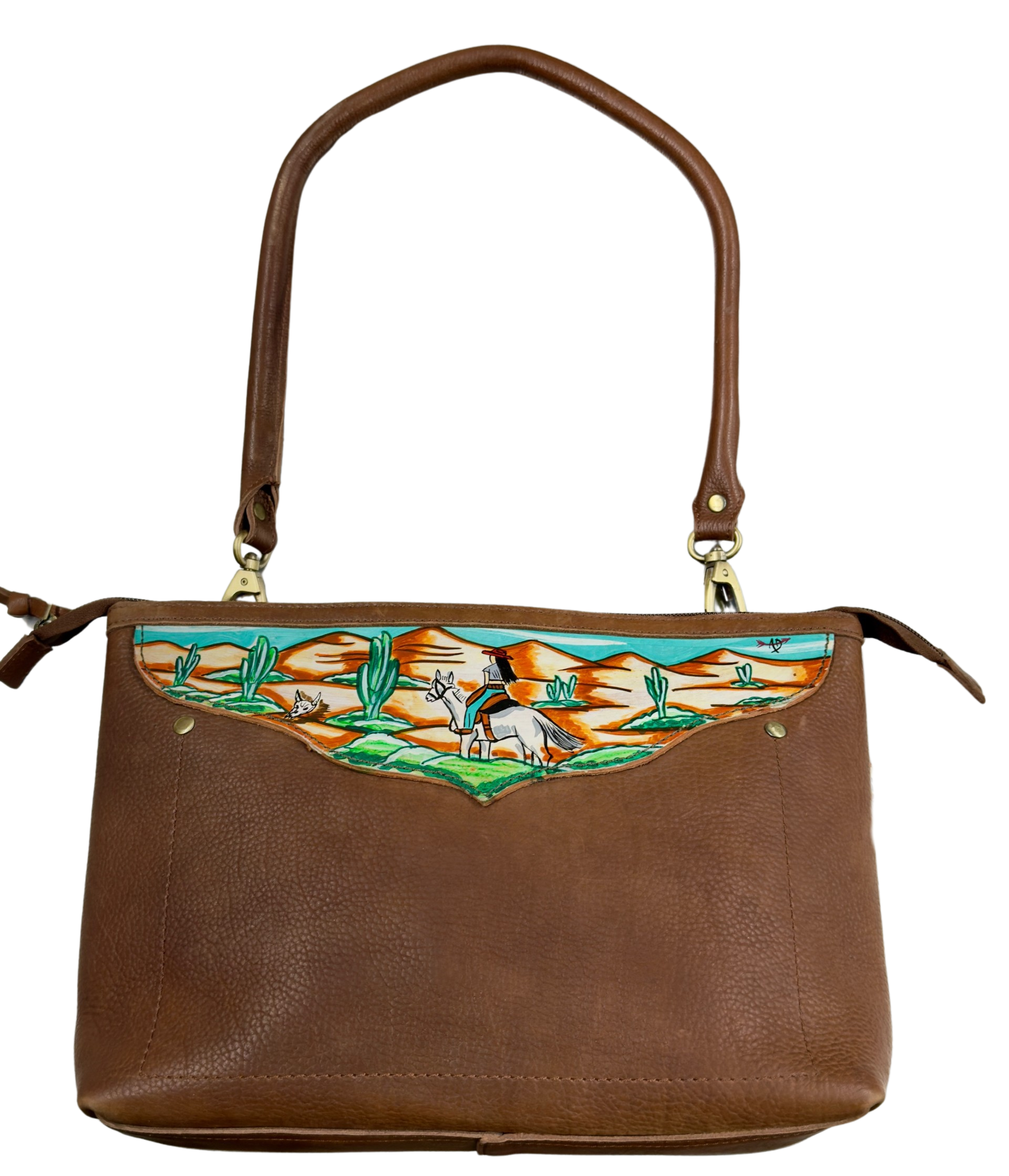 Handcrafted brown leather purse featuring a striking Painted Desert scene. This versatile bag measures 13" x 9.5" x 4.5", offering plenty of space for daily essentials. The rich leather develops character with use, while the artistic design adds a touch of southwestern flair to any outfit.