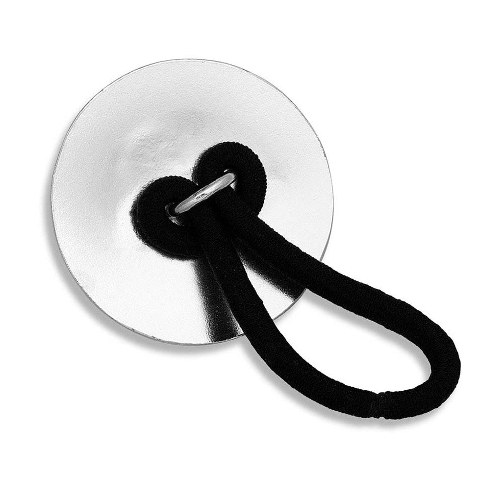 This bright silver finished round concho has classic bright-cut engraving flowing throughout the piece with an antiqued gold finished figure of a cowgirl on a bucking horse in the center circle. Braided leather cords have silver toned tips. One size fits most.