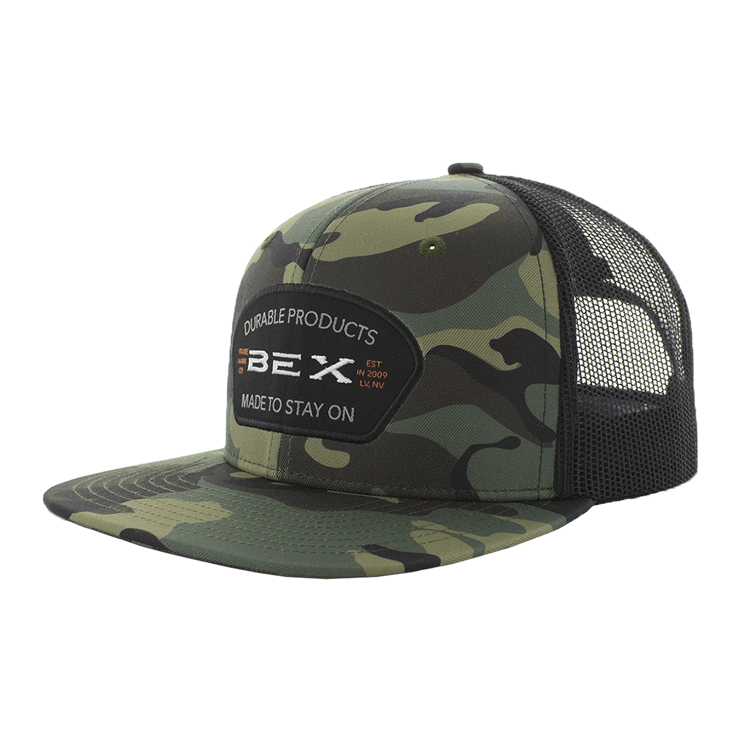 BEX® design embroidered woven label on the crown. Features a flat bill.