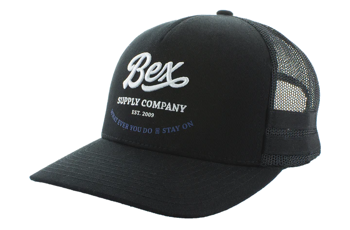 - BEX Logo in 3D embroidery with flat embroidery and screen printed letters.