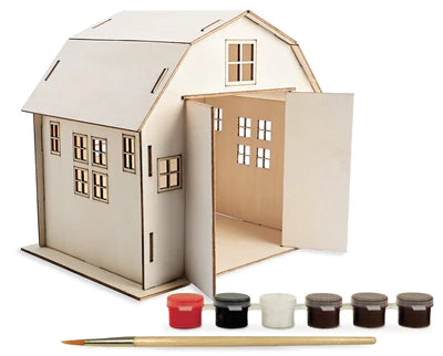 Build, paint, and play! This fun, new playset features an easy-to-build, 11-piece wood barn that requires no tools or glue! Just slide the tabs into the slots and you've got yourself a barn.
