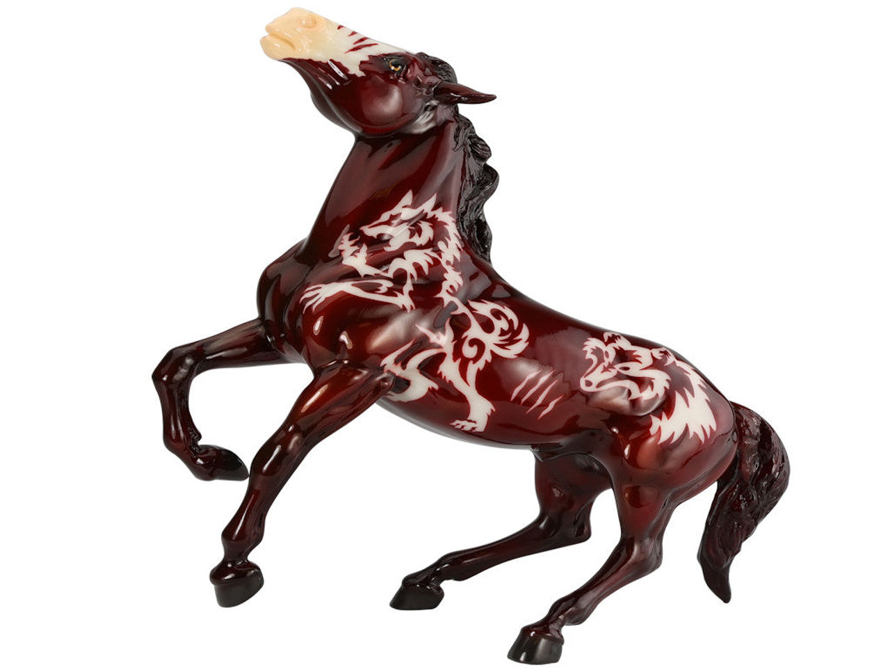 This werewolf-inspired Halloween Horse is posed as if he is calling to the sky, or perhaps, to the beautifully eerie wolves on both of his sides! Claw marks and hints of the full moon complete his tranformative look. When the light of the moon is hidden behind the clouds Beowulf will still stand out, as all of his white markings glow in the dark! A Glossy Hallowwen limited edition, he features "Beowulf" on his belly