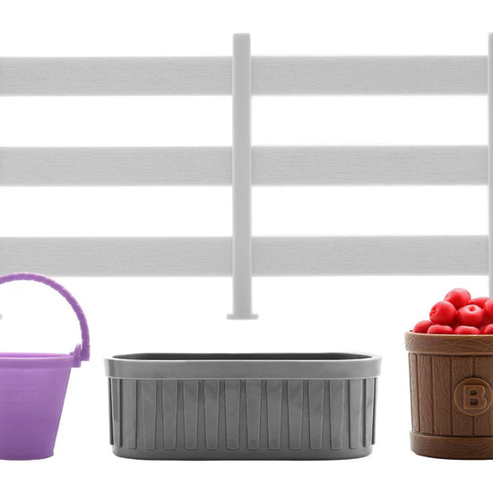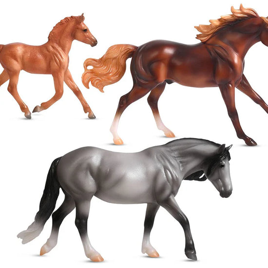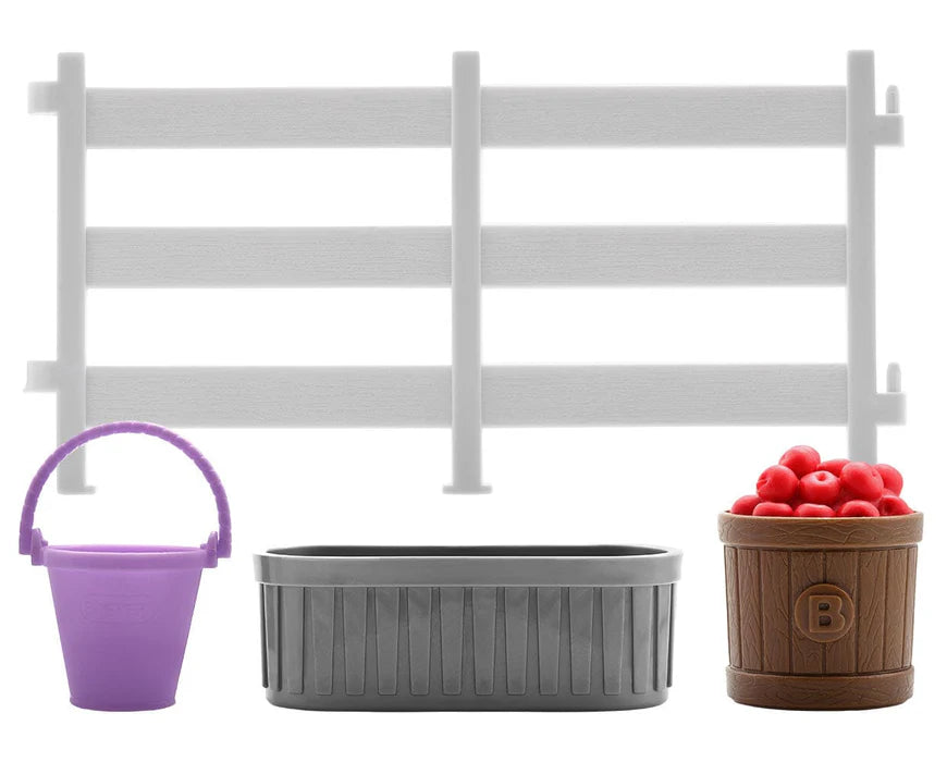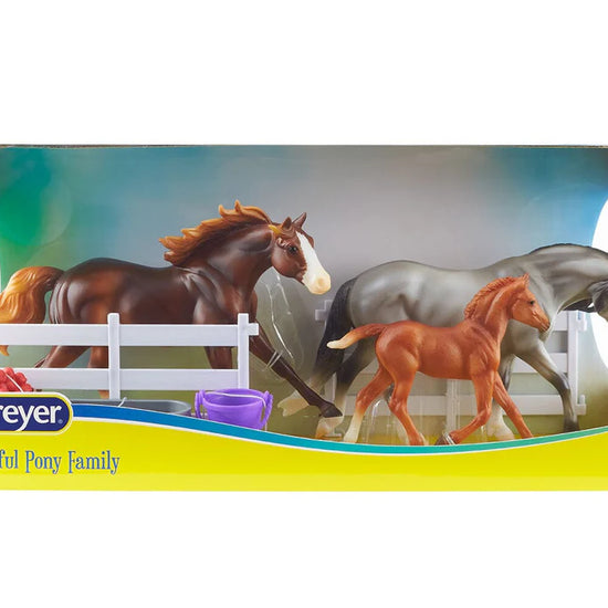 This playful pony family features a flaxen chestnut stallion, a grey mare, and their chestnut foal. It is a complete playset and includes six pieces of fencing, a water trough, feed pail, and a barrel full of apples. Get ready to play!