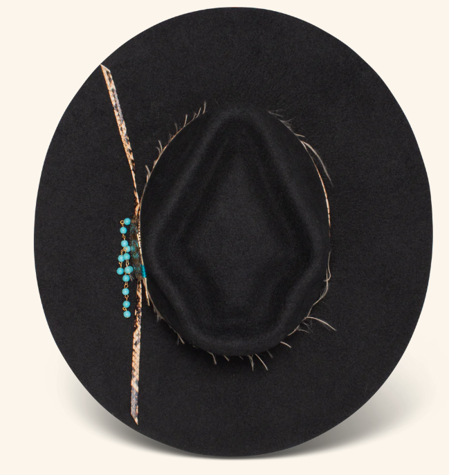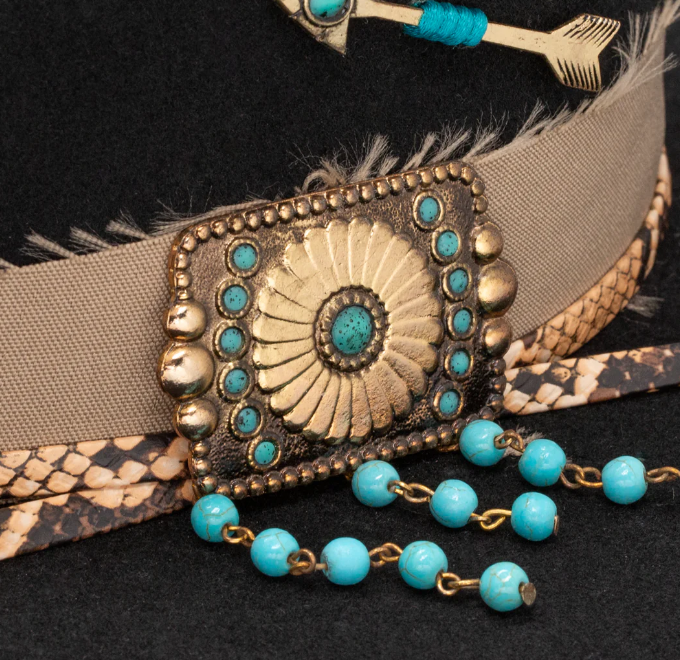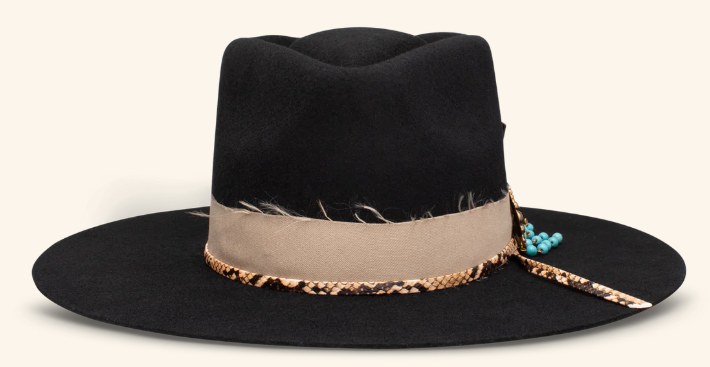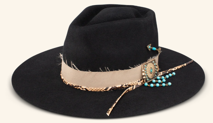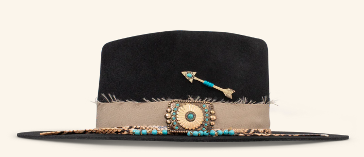Named for the first song Lainey Wilson ever wrote, the Lucky Me Hat draws from Indigenous American aesthetics and classic country themes. This firm-felt hat offers an arrowhead crown with a 4” flat brim. A frayed ribbon with faux-snakeskin band lends texture, while custom antique brass conchos with beaded detailing complements the hat’s black and natural hues. A cloth sweatband adds resilient comfort. The Lucky Me Cowboy Hat is part of our Charlie 1 Horse by Lainey Wilson Collection.