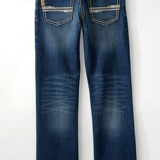 Cinch Boy's Dark Stonewash Slim Fit Jeans feature 11.75 oz. performance stretch denim and are finished with subtle hand sanding, whiskers and chevrons. An adjustable waistband provides a secure fit, ideal for all-day comfort and wearability.