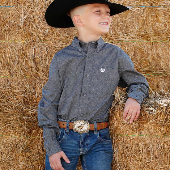 Cinch Boy's Grey Circle Pattern Button Down Long Sleeve Shirt