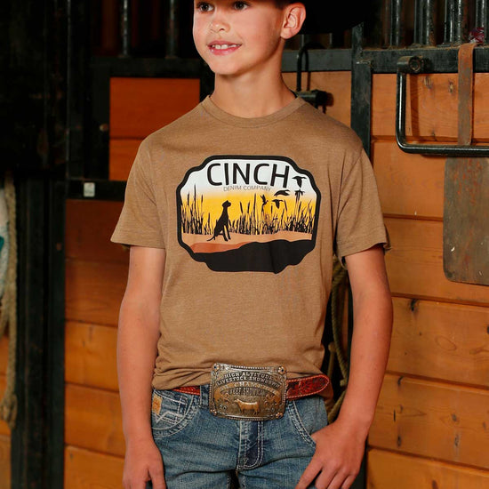 This Cinch Boy's Light Brown T-Shirt combines comfort and style with its soft 60% cotton and durable 40% polyester blend. Featuring a classic crew neck and short sleeves, it keeps him comfortable all day. The front showcases a captivating sunset graphic with a retriever and flying ducks, perfect for young outdoor enthusiasts. Designed to inspire adventure, this shirt is both a practical and eye-catching addition to his wardrobe.
