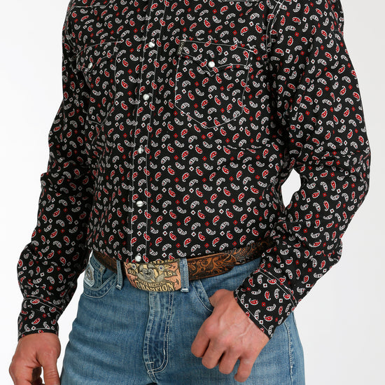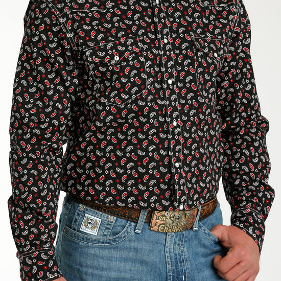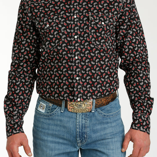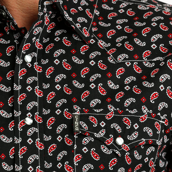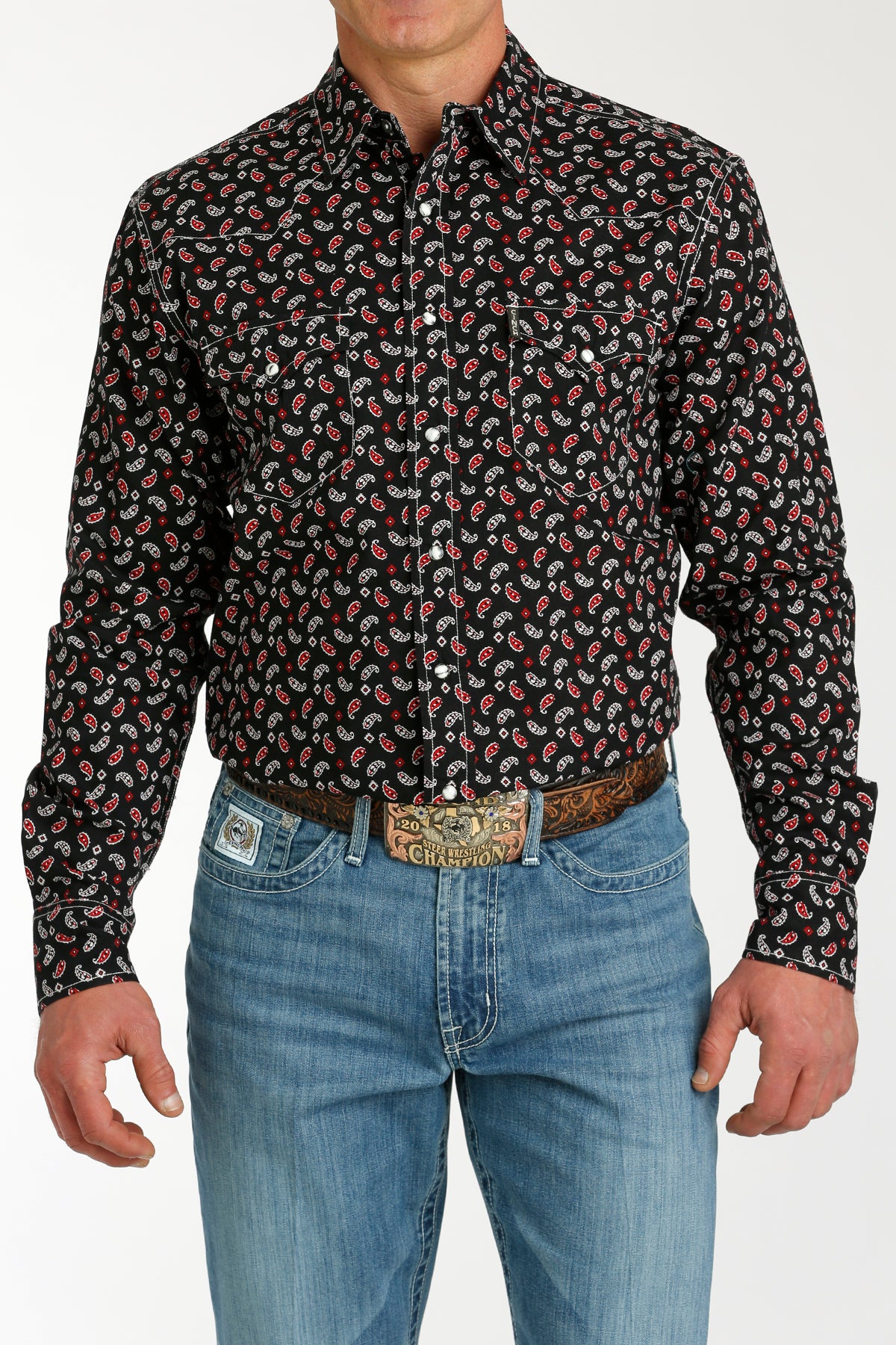 Elevate your style with Cinch Men's! Featuring a bold black, red, and white paisley print, two snap flap pockets, and contrast white top stitch, this modern fit shirt is both fashionable and functional. Made with 100% cotton and white marble snaps, it's a must-have for any wardrobe. Long sleeve and spread collar add the perfect finishing touch.