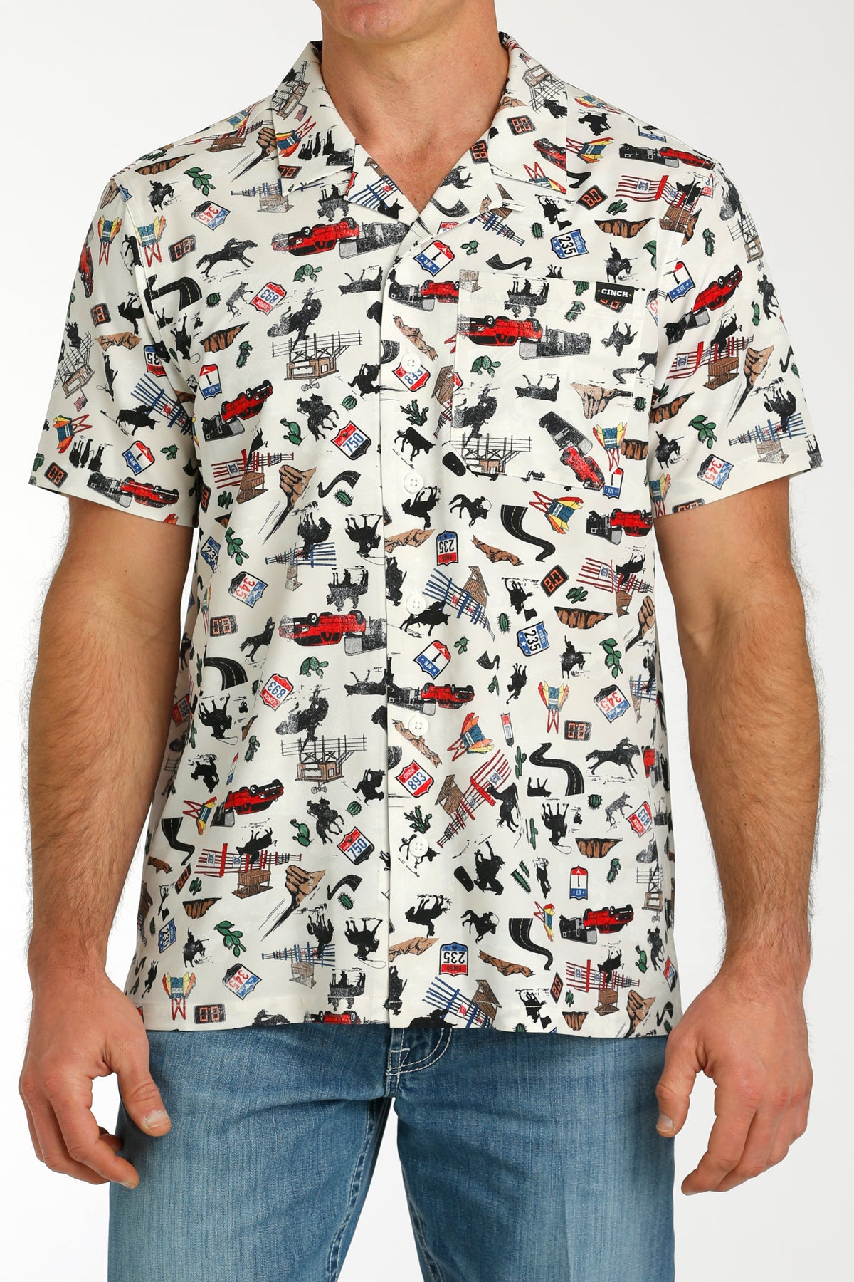 Saddle up in style with the Cinch Men's White Rodeo Print Camp Shirt. Made with a comfortable blend of 95% polyester and 5% spandex, this short-sleeve button down shirt is perfect for any cowboy. Gear up for rodeo season with this bold and playful design.