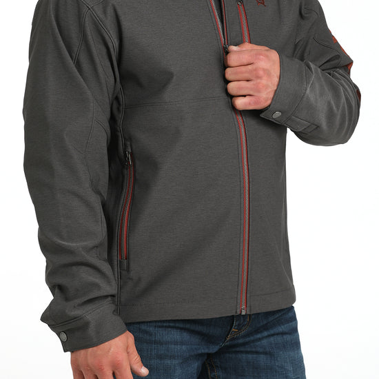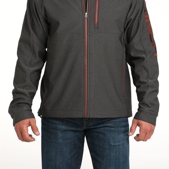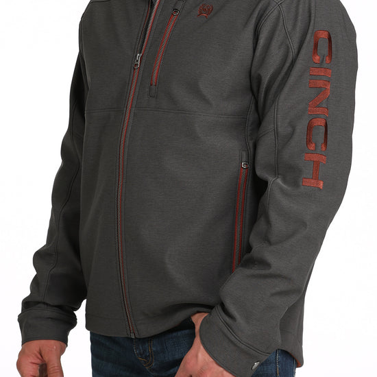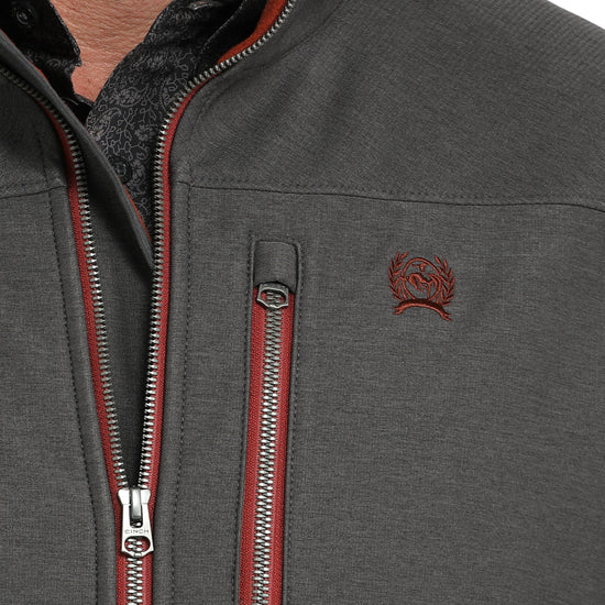 This charcoal bonded jacket delivers versatile style with practical edge. Rich rust lining creates an eye-catching contrast that shows with every wear, while embroidered logo graphics add authentic personality. Dual zip pockets—one at the chest and two at the hands—keep your essentials secure and accessible. The full zip front closure makes layering simple, and adjustable cuffs provide a customized fit for any build. Crafted from a resilient polyester blend with a commanding stand collar, this jacket transitions seamlessly from casual outings to weekend adventures. Built to last and designed to impress.
