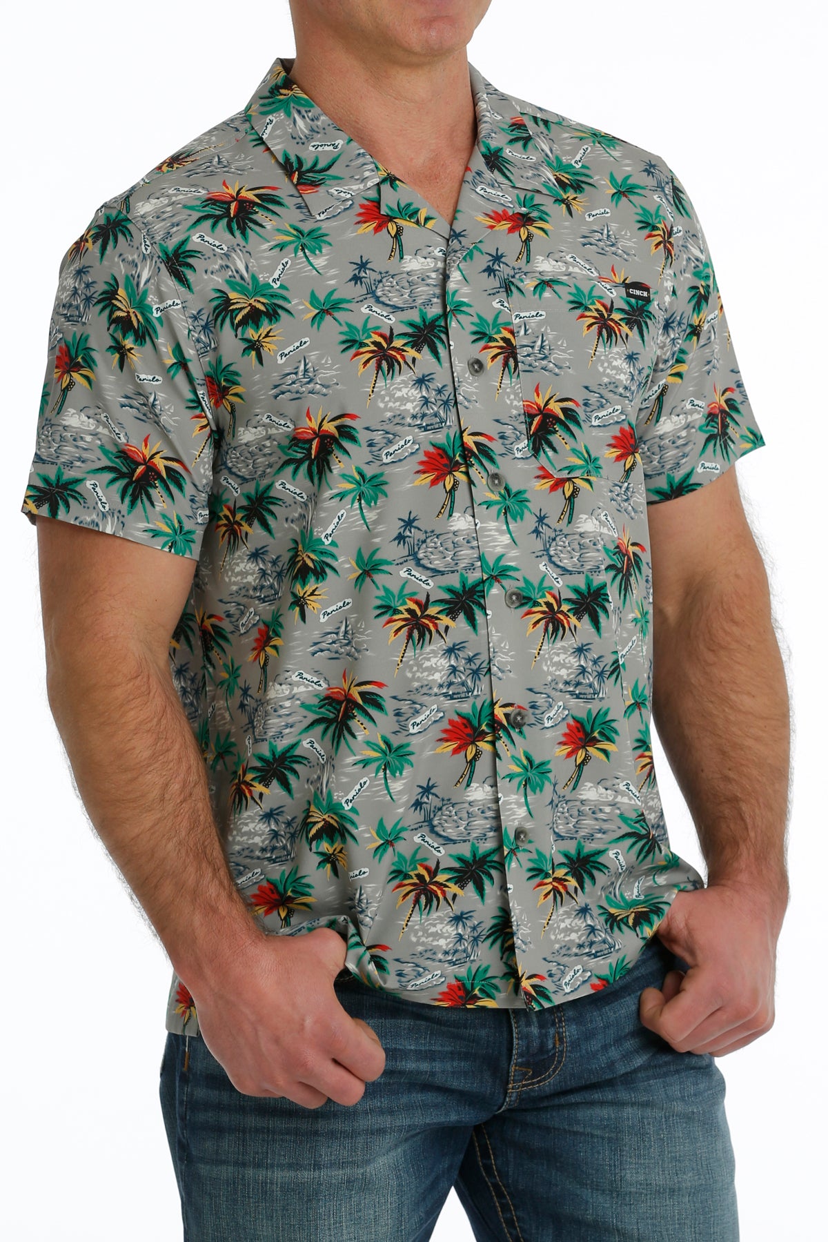 This Cinch Men's Grey Hawaiian Camp Shirt is professionally designed for comfort and style. Made with printed poly-spandex woven fabric, it features a button-down front and left chest pocket. The short sleeves and gray marble buttons add a touch of sophistication. Perfect for any occasion, this shirt is sure to impress.