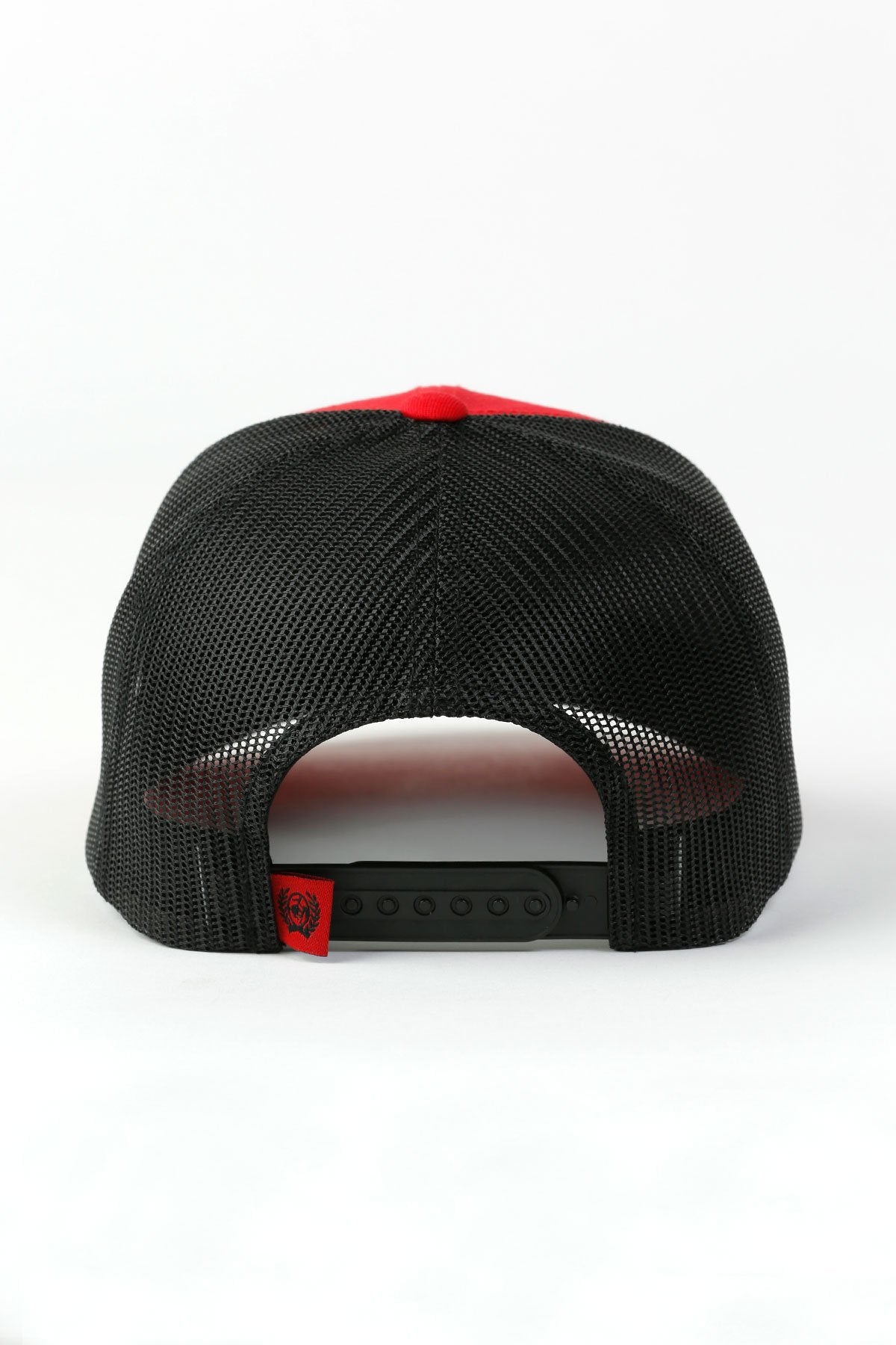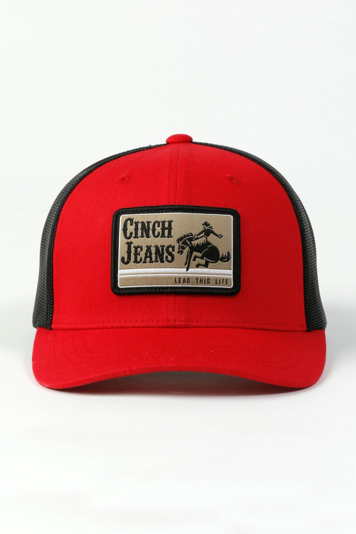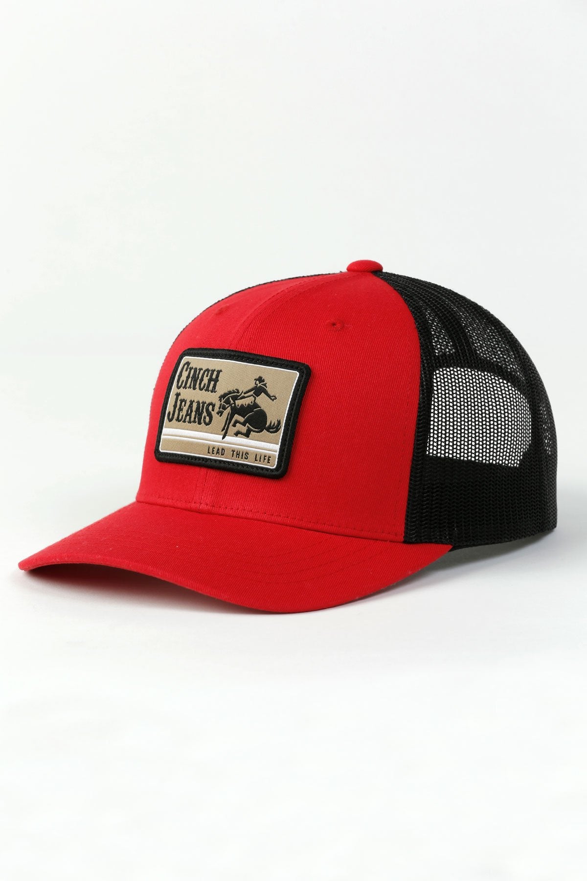 Daily ranch chores call for stylish sun protection from a comfortable cap like this red Flexifit trucker by CINCH. Designed with a bronc rider woven logo patch, this cap is a must-have accessory for topping off a Western snap shirt and blue jeans. Features a secure back snap closure.