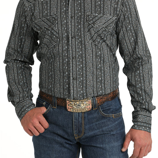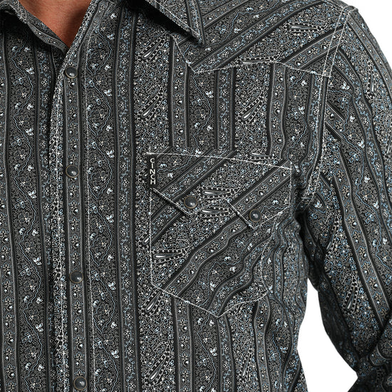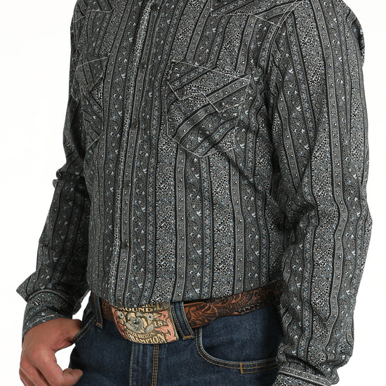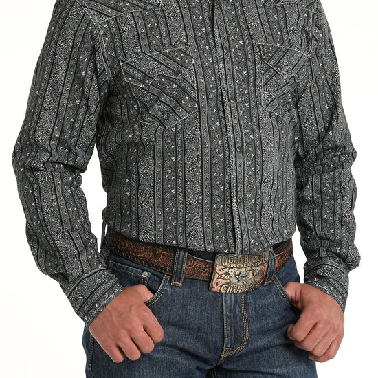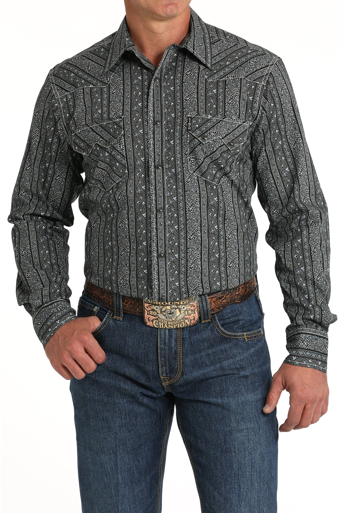 Classic Western details accent this Modern Fit black printed cotton plain weave by CINCH that belongs in every cowboy's closet. Design features include contrast topstitch, double front pockets, authentic yokes, and black marble snaps. Long Sleeve, Wallpaper Stripe Pattern.