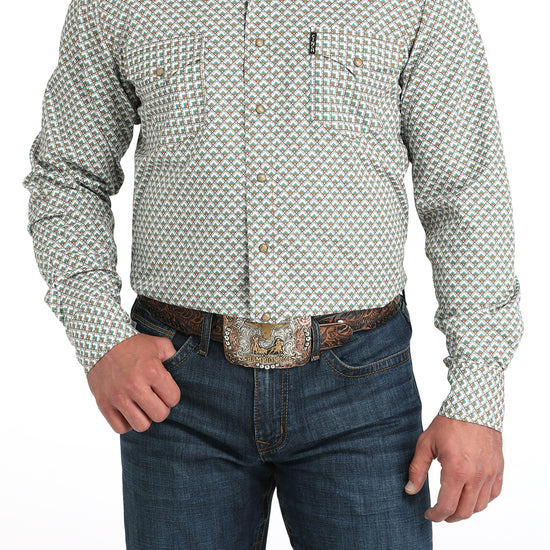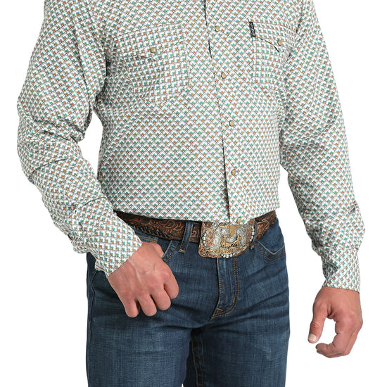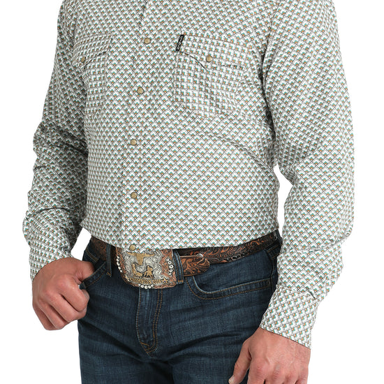 Experience comfort and style with the Cinch Men's White Print Modern Fit Snap Shirt. Crafted from 100% cotton, this long-sleeve shirt offers breathable softness for all-day wear. The modern fit enhances your silhouette while snap closures provide easy, secure fastening. Dual front pockets add practical storage, perfectly blending function with classic Western appeal. Ideal for those who want a versatile shirt that stands out with subtle print detail.