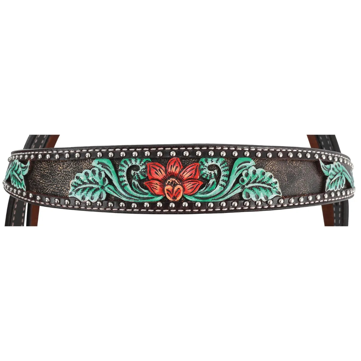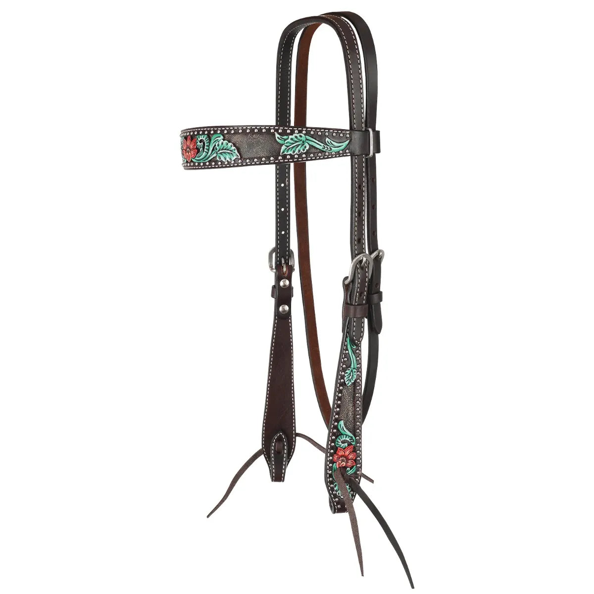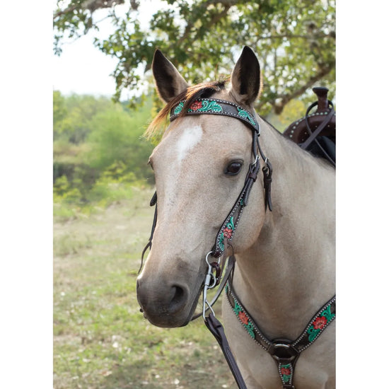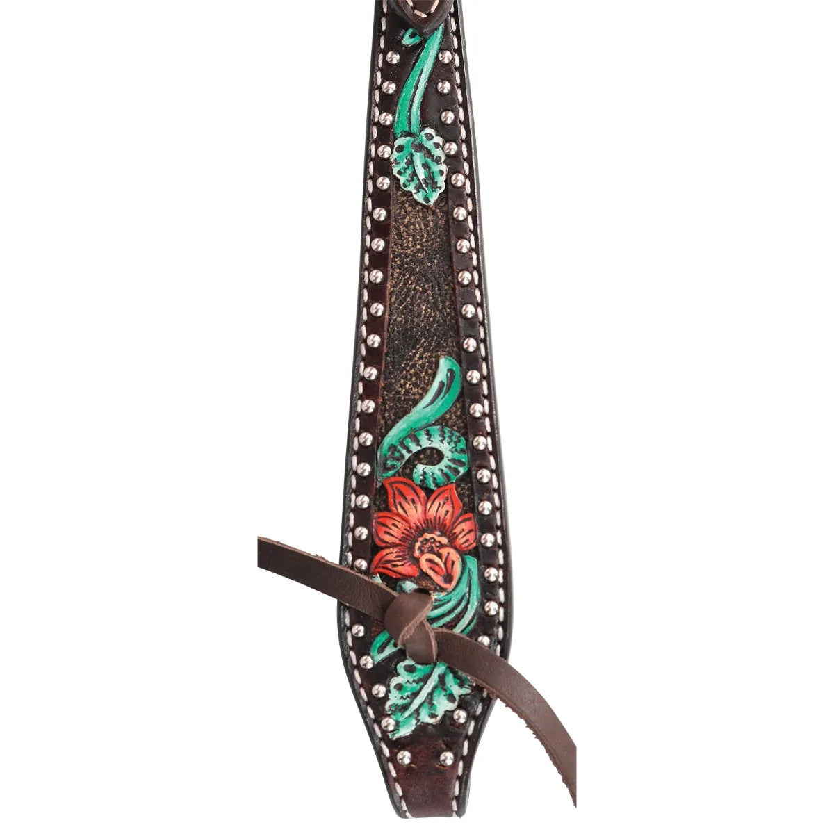 Soft chocolate leather is embellished with distressed exotic leather inlays, hand-tooled and painted vibrant cactus flowers, and silver spots for a touch of shine. This browband headstall is 5/8” so it’s not too wide or too thin, but just right and works well on an average size horse. The stainless steel hardware will last to give you lots of use from this eye-catching headstall. The colors look pretty on any horse color.
