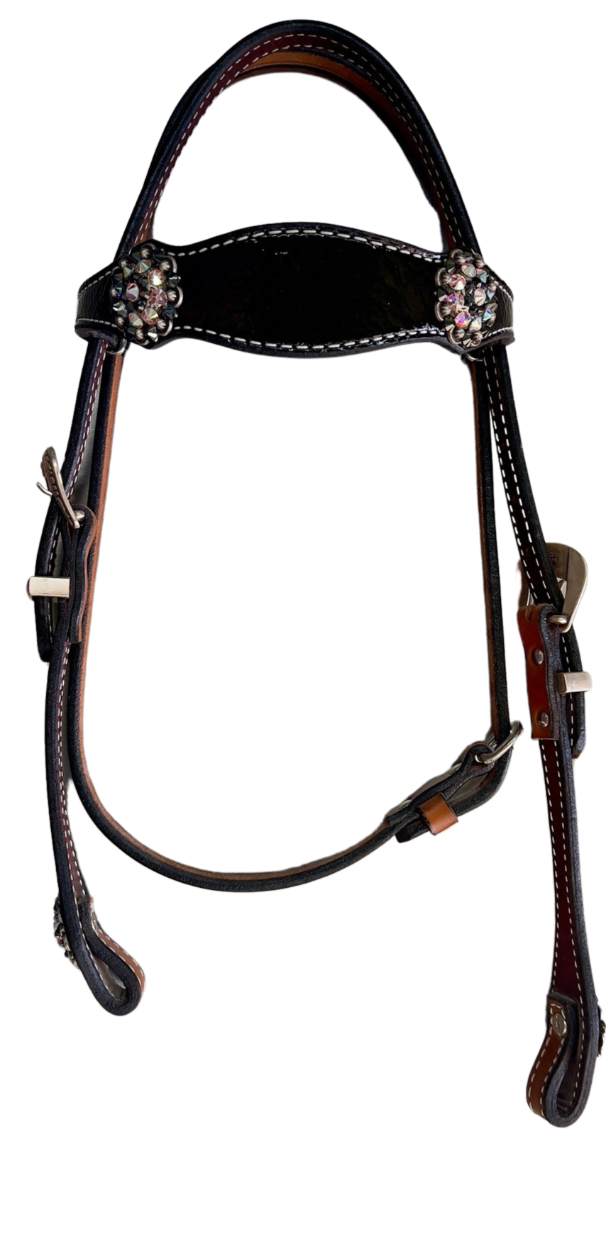 Upgrade your horse riding experience with our Circle Y 2 Tone Black & Brown Headstall. Adorned with Jet-Crystal Clear Antique Silver Berry Rhinestone Crystal Conchos, this headstall adds a touch of elegance to your tack. Enhance your horse's look while enjoying a secure and comfortable ride.