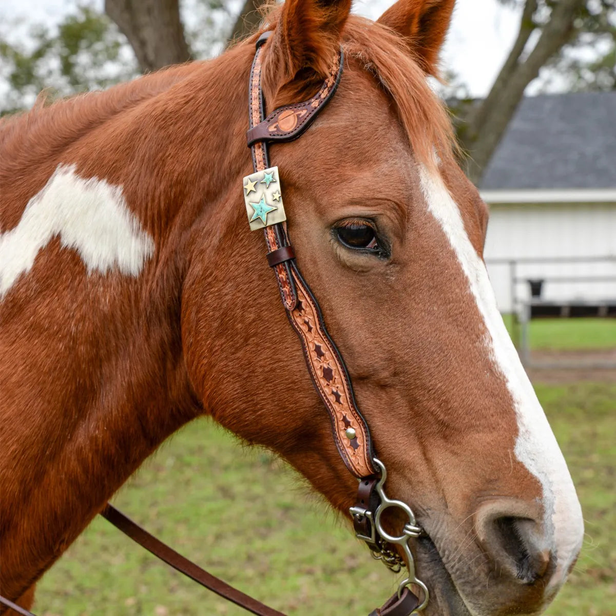 Looking for something out of this world? This Saturn Rising One-Ear Headstall is the perfect addition to your tack collection! It features a Saturn stamp, Box Diamond geometric tooling, and a vintage finish. The custom turquoise star conchos make this piece pop and add a touch of fun and flair. This headstall is sure to turn heads when you're in the arena or out on trails!
