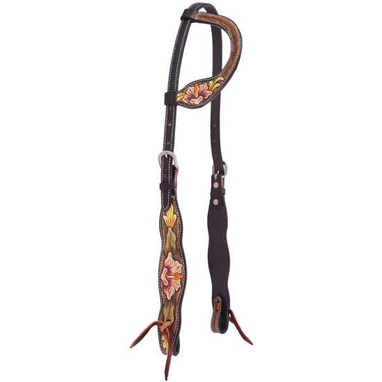 Introducing the Texas Grace One Ear Headstall! This beautiful headstall is hand tooled and hand painted with floral accents in pops of gold, green, pink, and cream. It's the perfect accessory for any rider who wants to add a touch of style and elegance to their look. Whether you're competing in the arena or just riding for pleasure, this headstall will help you stand out from the crowd. Made from high-quality materials, it's built to last and will keep you looking sharp for years to come.