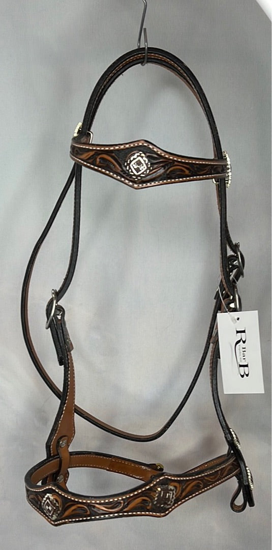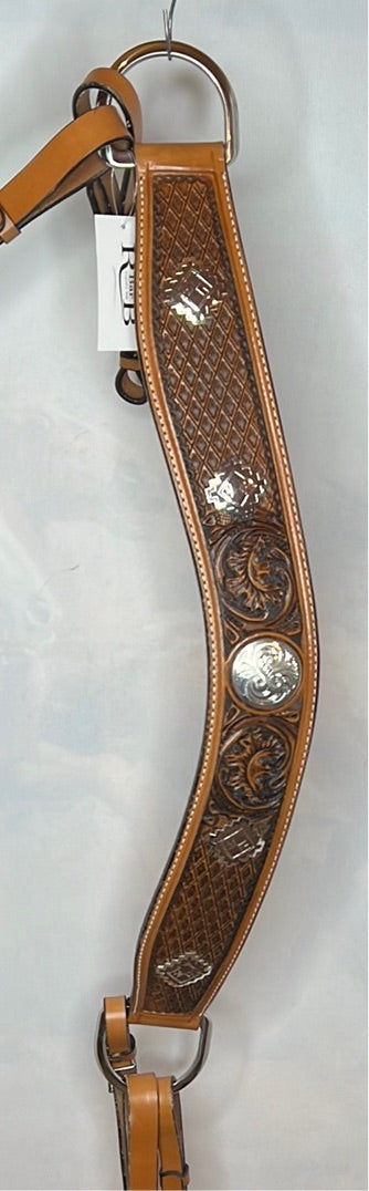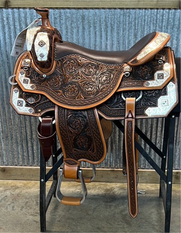 Package includes Headstall and Breast Collar. Full Oak Leaf/Southwest Diamond Combo Tool Chocolate Vintage on Regular Oil. Full Navajo Design Silver Package. One of a Kind Opportunity !!