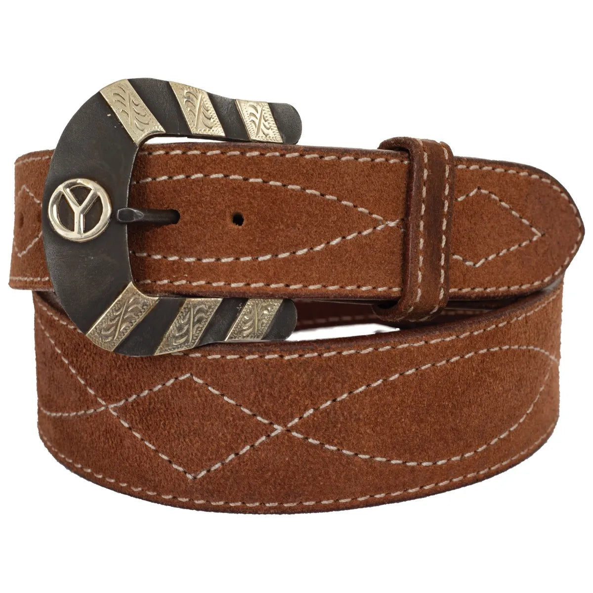 The Circle Y Stockman Men's belt is the perfect accessory for any man. With its stylish figure 8 stitched design and trendy brown iron buckle, this belt is durably made for work while maintaining a fashionable look for play. Its vintage style is perfect for any outfit, and its durability ensures it will last through any activity. Whether you're dressing up for a night out or just looking to add a finishing touch to your everyday look, the Circle Y Stockman Men's belt is a perfect choice. Measures 1 1/2" wide with a brown iron with silver etched detailed belt buckle.