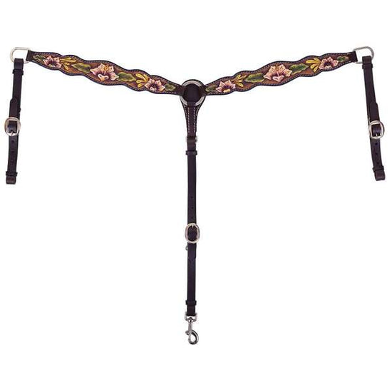Add a touch of elegance to your look with the Texas Grace Breast Collar. This beautiful piece is hand-tooled and hand-painted with floral accents in pops of gold, green, pink, and cream.
