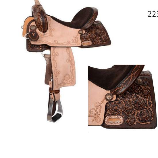 1/2 Tool Thorny Rose, Thorny vine border, vintage finish , roughout seat jockeys and fenders, square skirts, rawhide braided horn, 1.5'' leather cantle, chocolate suede bicycle seat, polish aluminum stirrups, hamley twist, gold scroll conchos