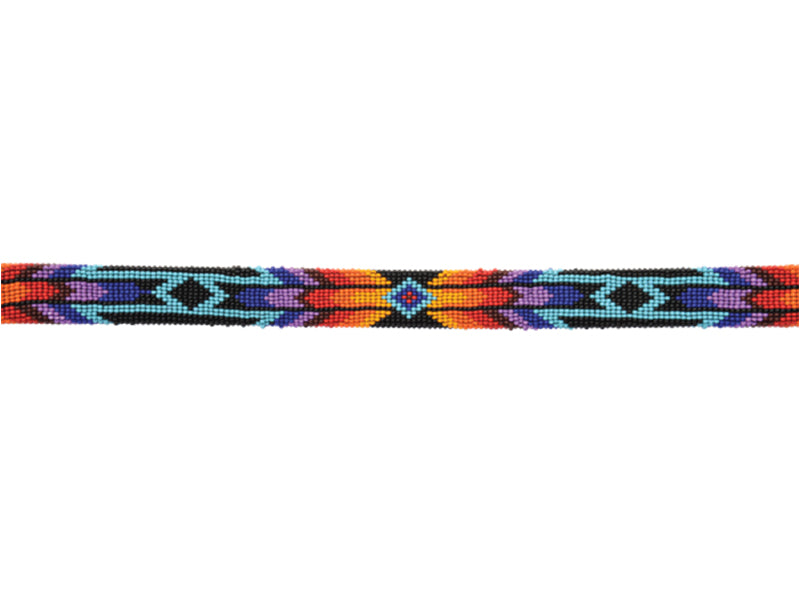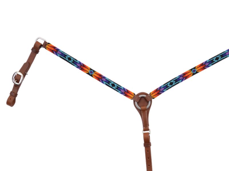 This quality harness leather breast collar showcases vibrant fully wrapped beading across the entire shoulder.