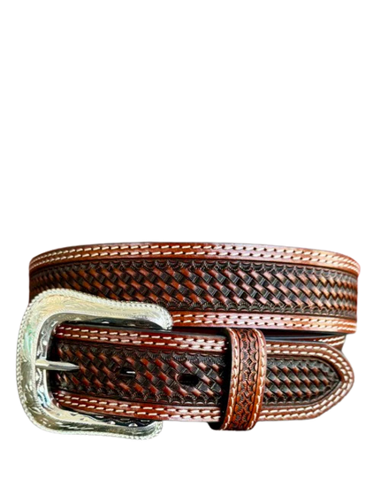 Cowboy Chrome Men's Cognac leather belt with a basket weave print and a silver scrolled buckle.