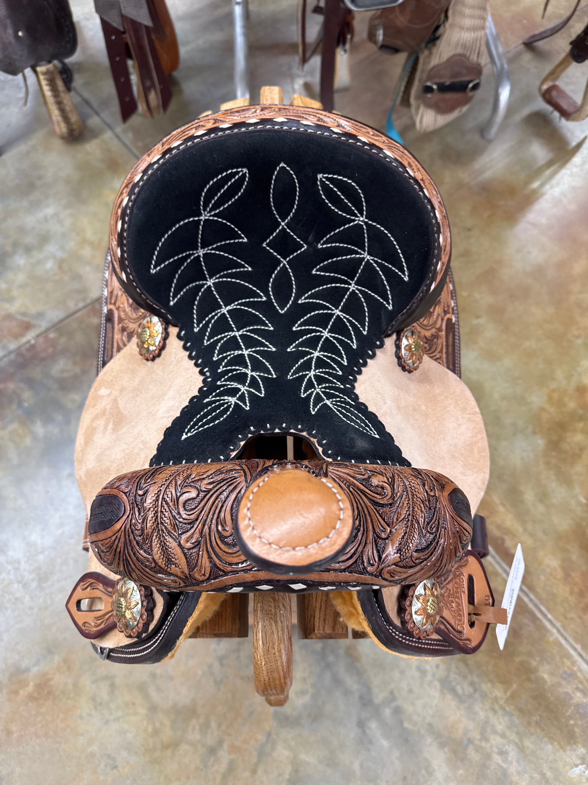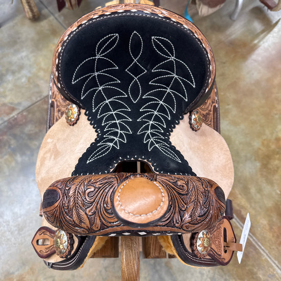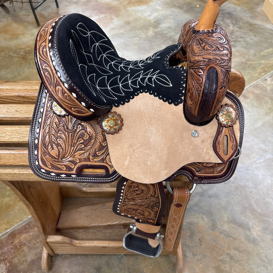 7/8 Tool Floral, Buckstitch, Black Suede Stitched Seat, Vintage Finish, Aluminum Barrel Racer Stirrups