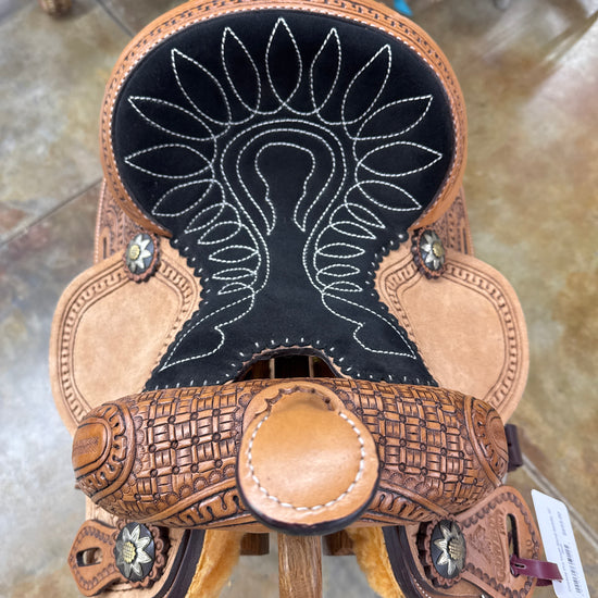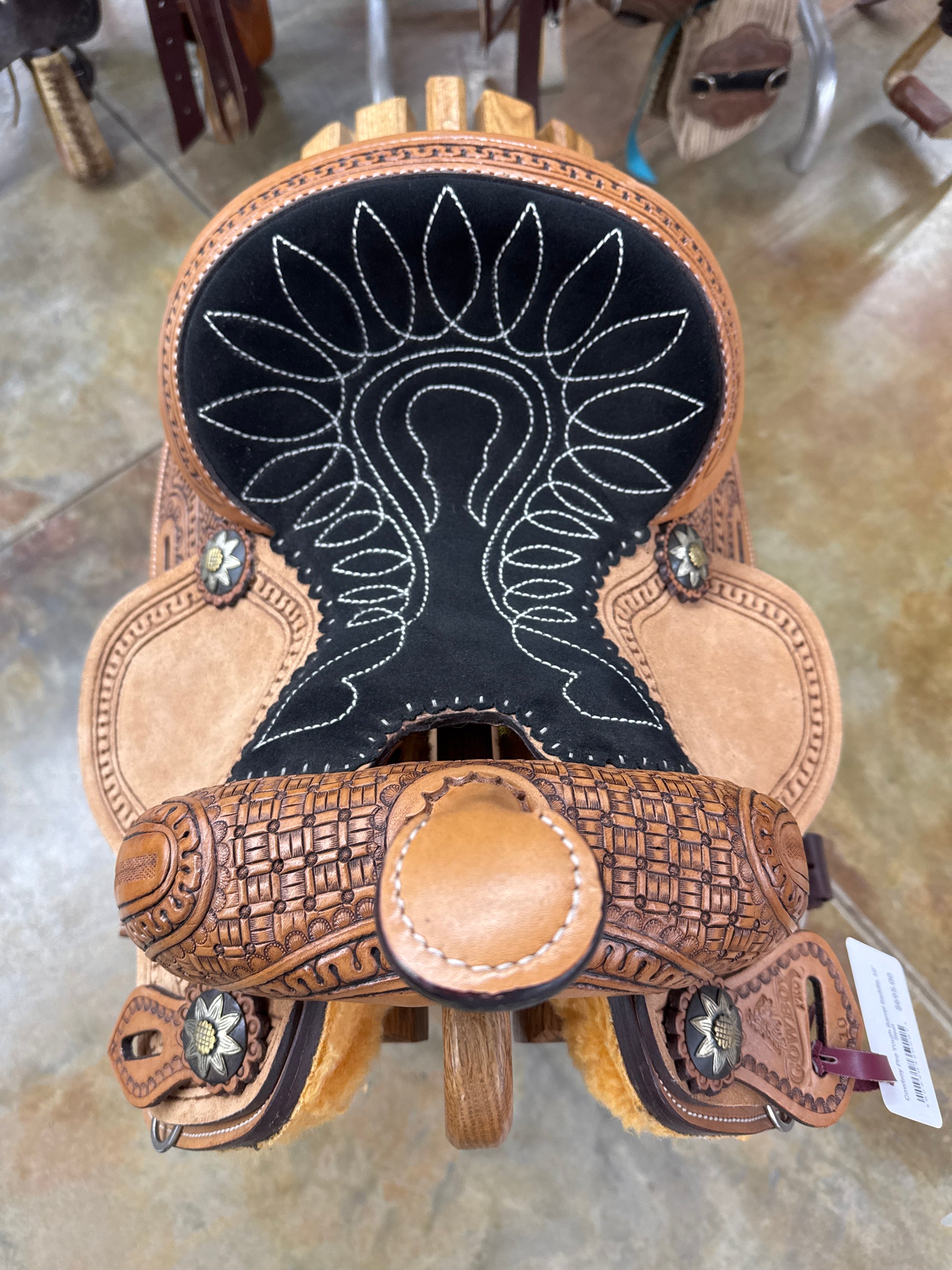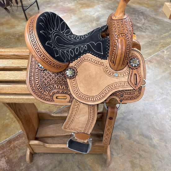 1/2 Tool Waffle, Running W Border, Roughout Jockey Fender, Black Suede Stitched Seat, Aluminum Barrel Stirrups