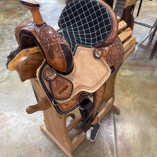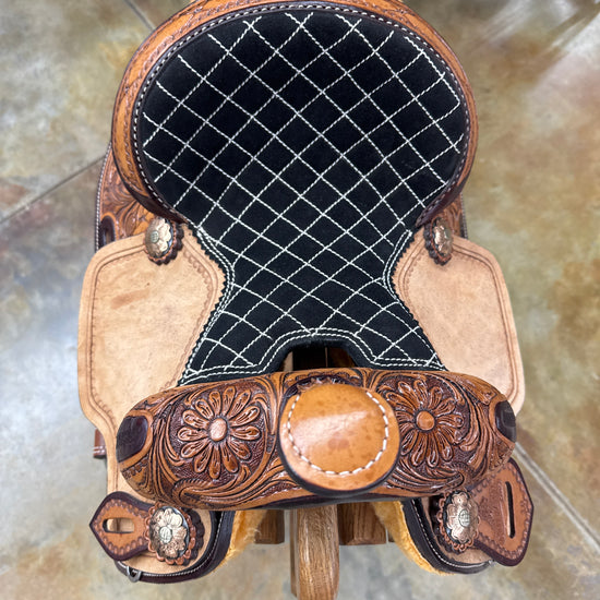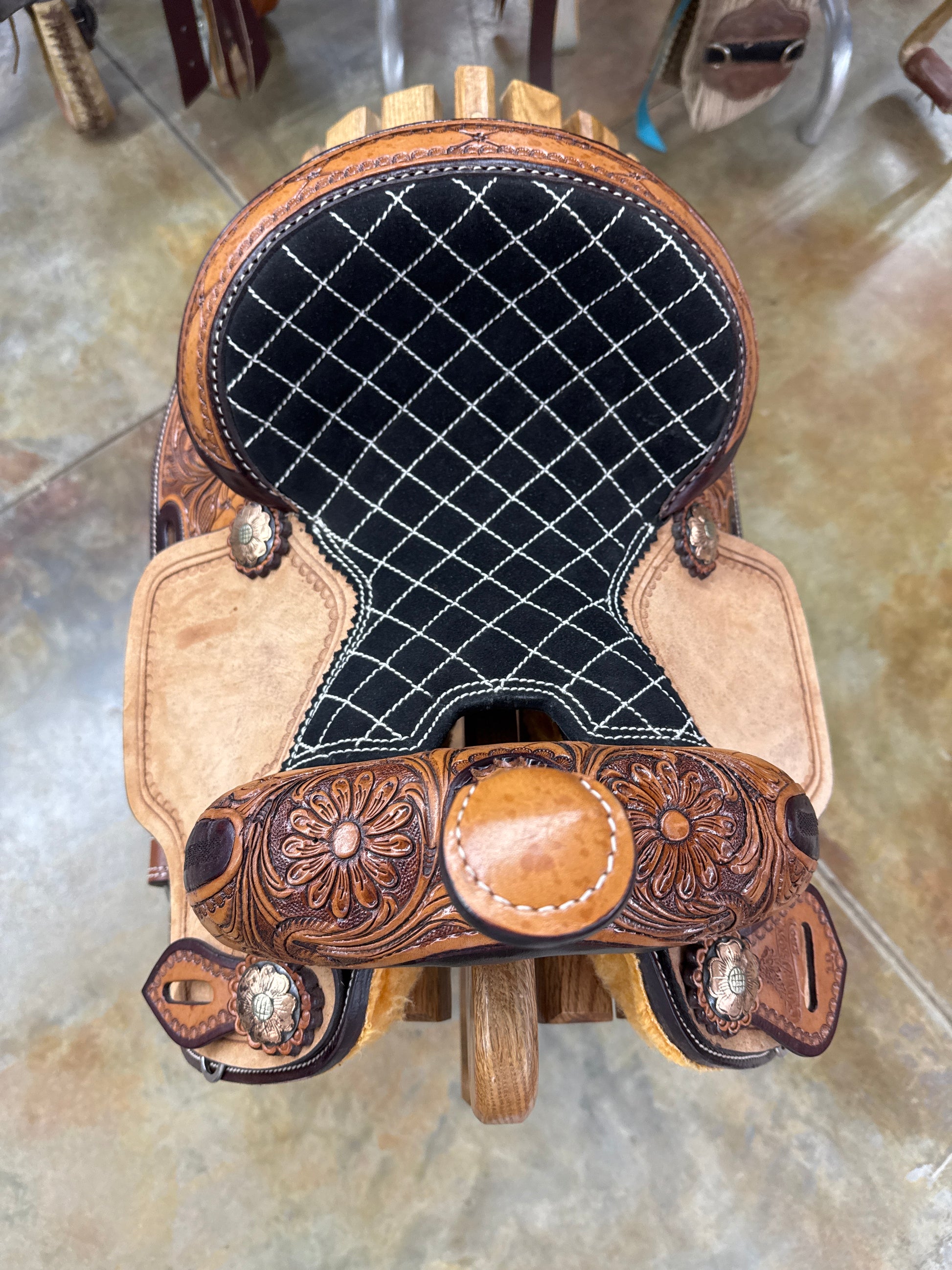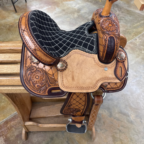 7/8 Tool Combo Lattice/Floral, Shell Border, Black Suede Stitched Seat, Vintage Finish, Aluminum Barrel Stirrups