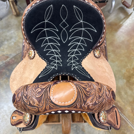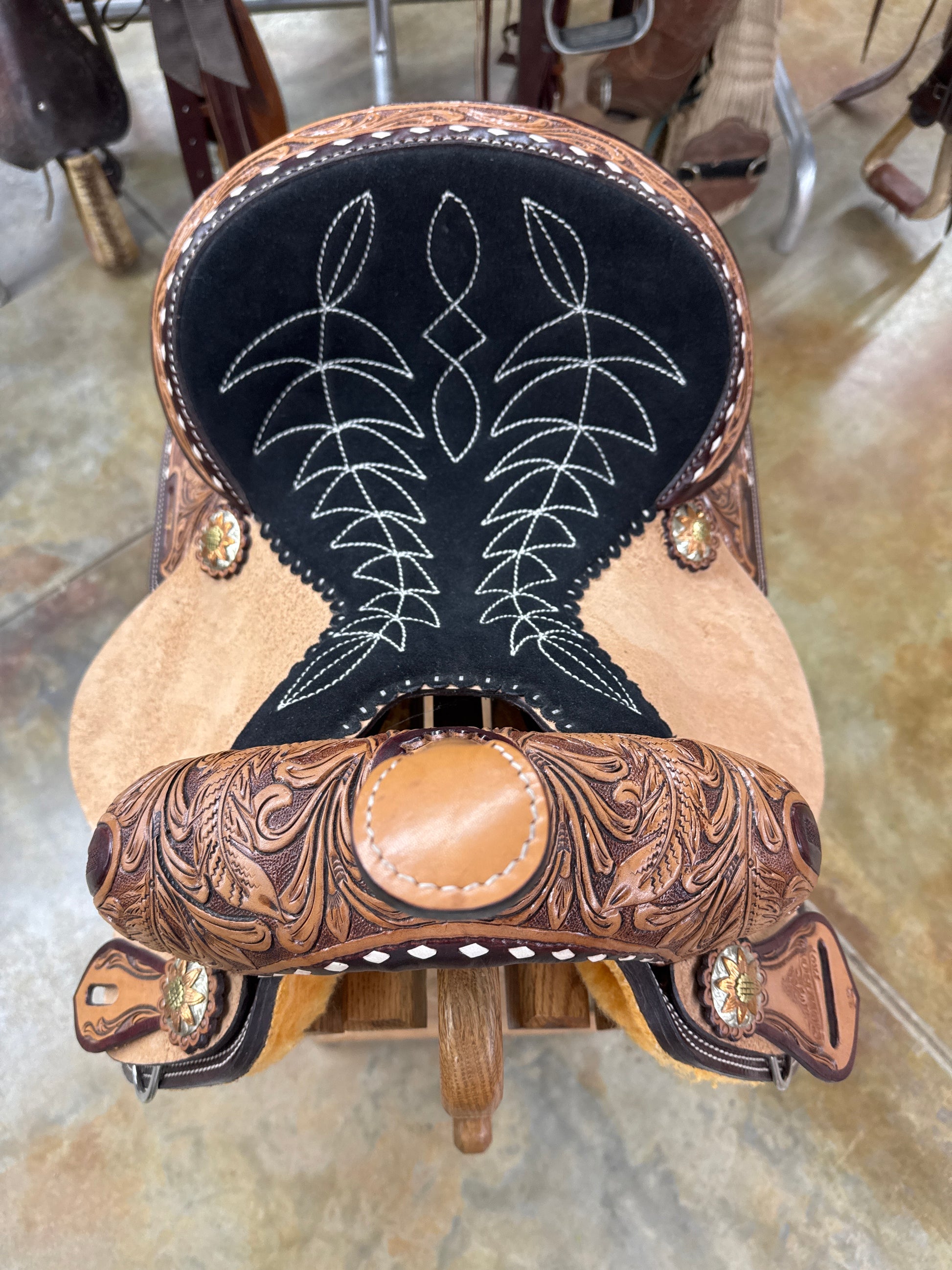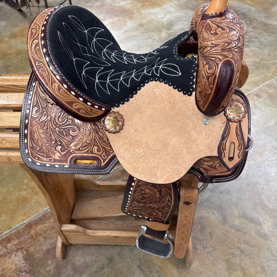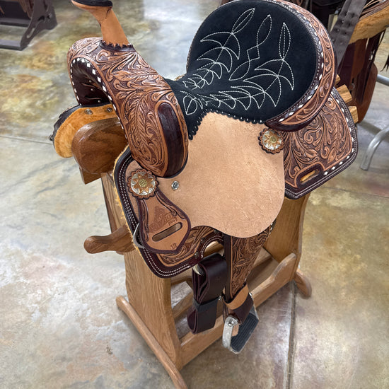 7/8 Tool Floral, Buckstitch, Black Suede Stitched Seat, Vintage Finish, Aluminum Barrel Racer Stirrups