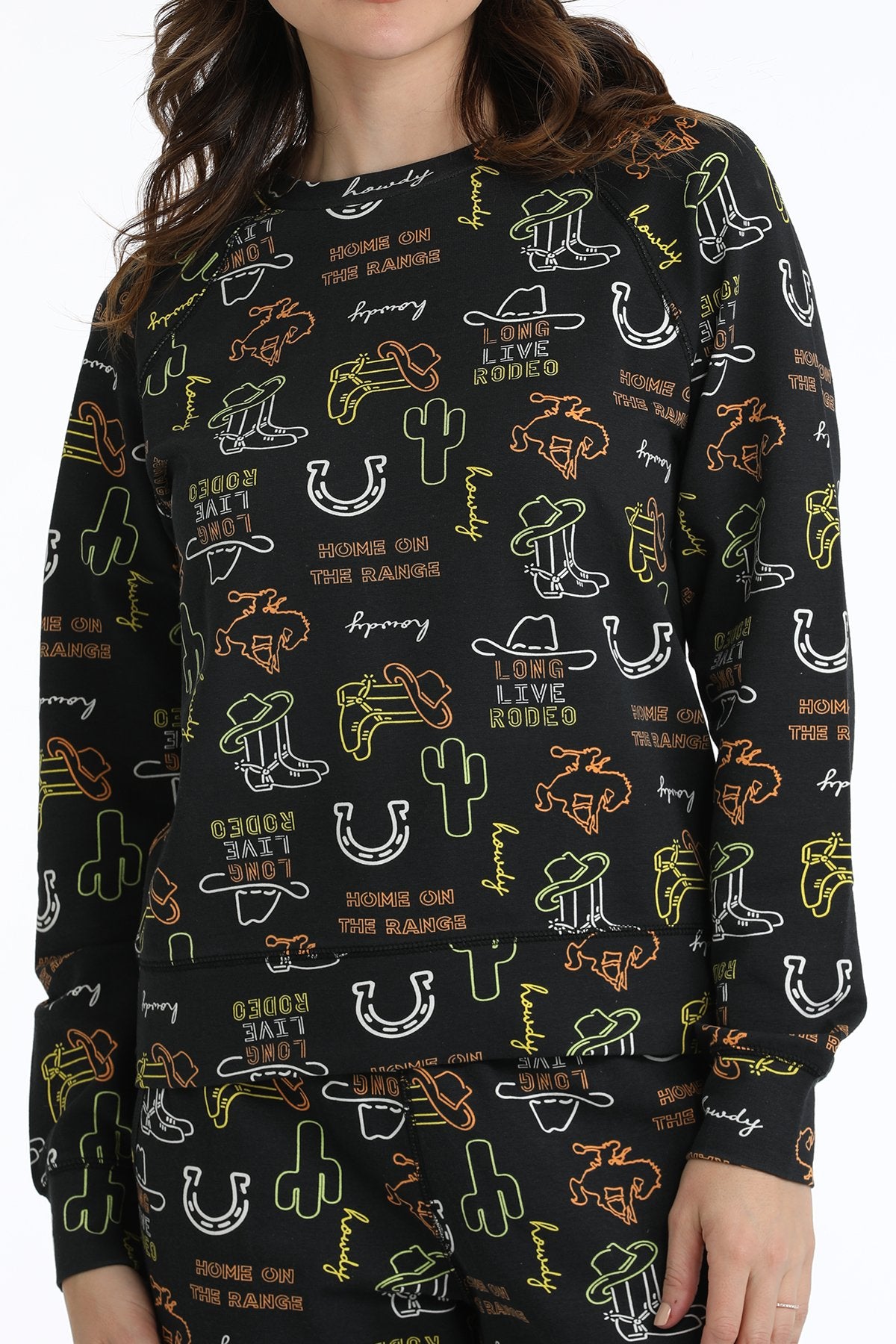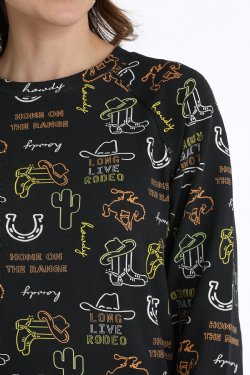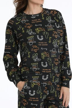 Sunset calls for unwinding in style wearing our black cotton/poly/spandex French terry raglan top. This long-sleeved pullover with a comfortable round neck features a ranch-lover’s print. Pair yours with matching joggers crafted by Cruel Denim.