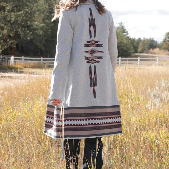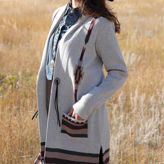 Western wear is trending, so stay fashion forward with our gray polyester sweater knit duster. A unique choice to finish any cowgirl look, this statement piece is crafted with an open front, side vents, patch pockets, and concho and faux leather detail. Style over your favorite snap shirt and new Cruel Denim blue jeans.