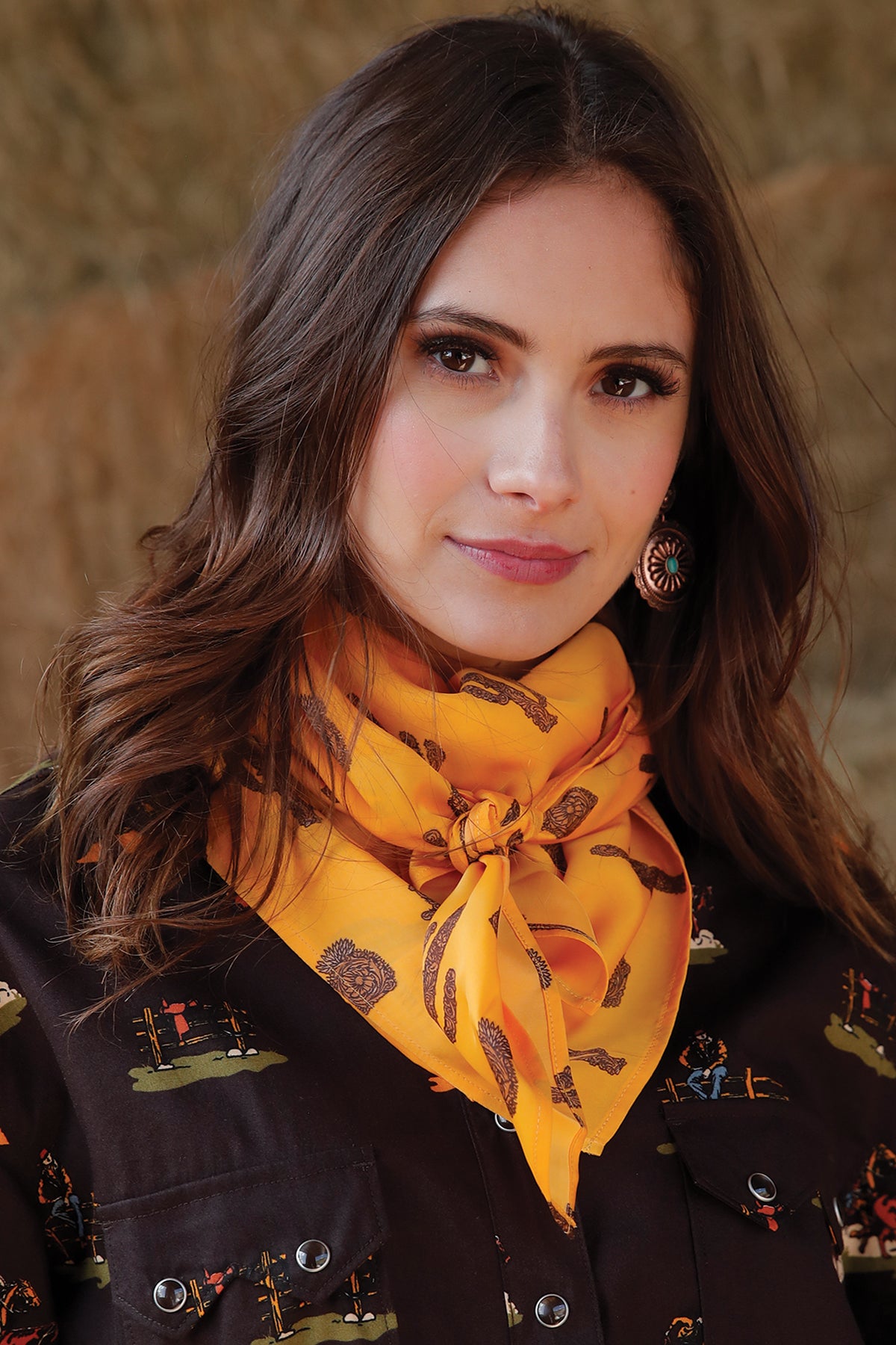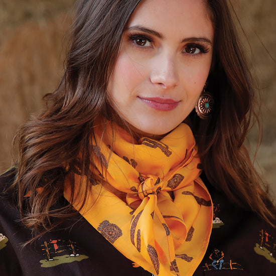 Add a dose of Western flair to your wardrobe with this yellow printed polyester wild rag crafted by Cruel Denim. Destined to be styled and used in various ways, this wild rag is the outfit accessory just waiting for every bonafide cowgirl. Rock yours with a new denim snap shirt and blue jeans.
