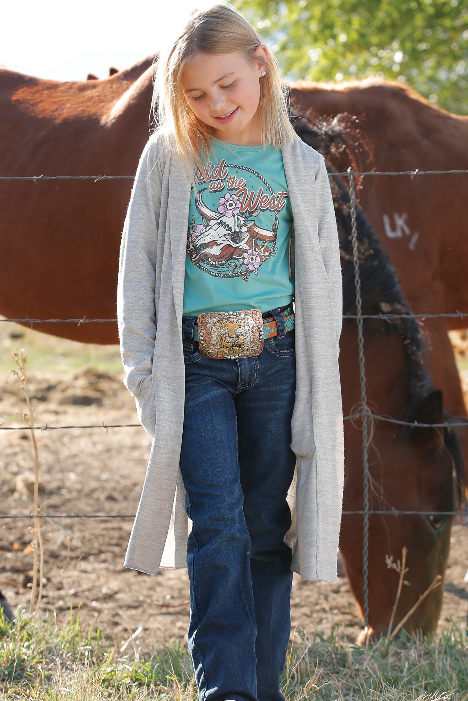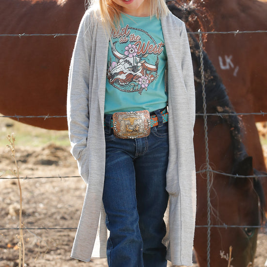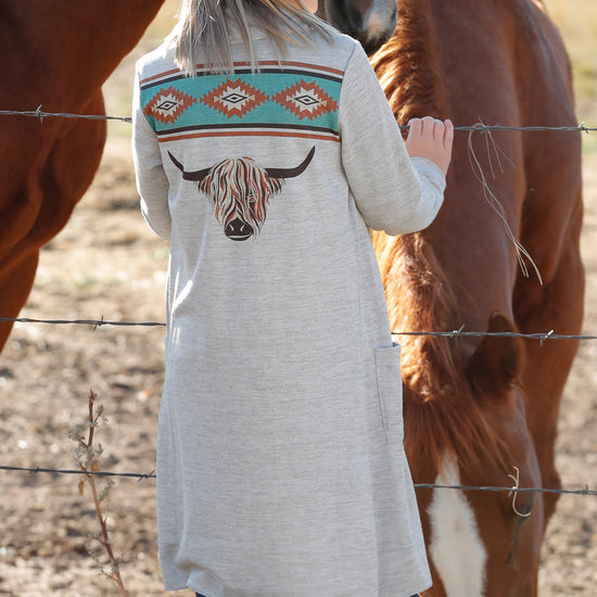 Shaggy hair don’t care! Our heather gray sweater knit duster with Southwest sublimation print speaks for itself. Sure to be tops on her wish list, this open front duster by Cruel Girl features comfortable poly-spandex construction and convenient patch pockets. Layer over a favorite tee and denim for the complete look.