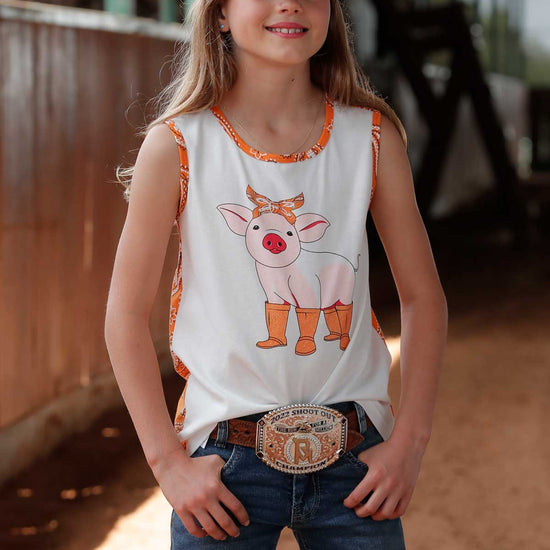 This playful tank top is perfect for any pig-lovin' gal! With a cream-colored front featuring an adorable pig graphic, and an unexpected orange paisley print on the back, this top is sure to turn heads. Add a bit of humor and quirk to your wardrobe with the Cruel Girl's Pig Tank Top.