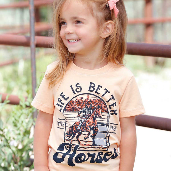 This toddler girl's t-shirt combines soft comfort with a lively design. Made from a breathable blend of 60% cotton and 40% polyester, it ensures cozy wear for active little ones. The peach-colored fabric features a vibrant barrel racing graphic on the front, celebrating a fast-paced, fun lifestyle. Perfect for spirited toddlers who love horses, this shirt brings both style and comfort to their everyday adventures.