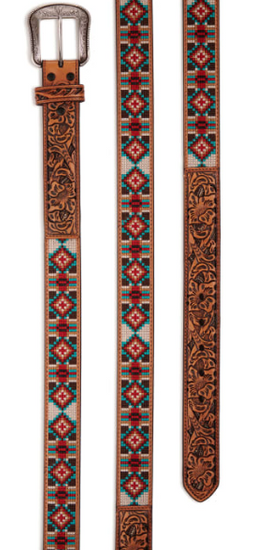 Men's brown and tan genuine leather belt by 3D Belt Company with an allover tan Aztec stitch design. Belt is accented with floral tooled tabs, and a removable silver buckle.