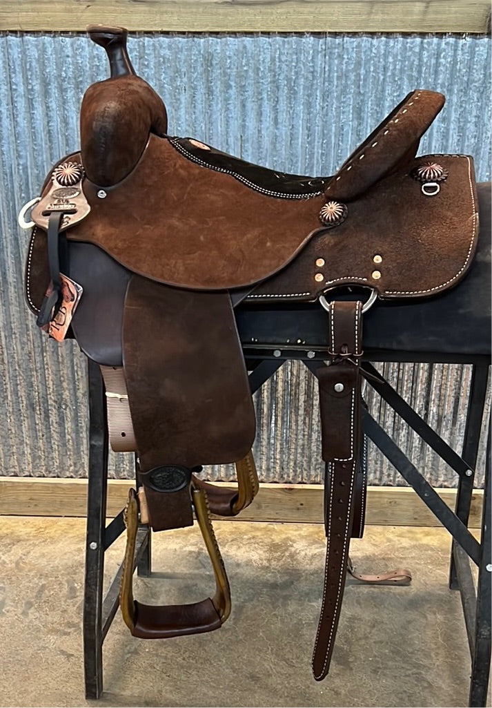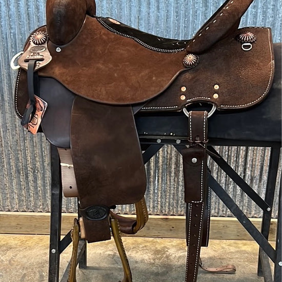 Chocolate roughout with black suede quilted seat and leather cheyenne roll. rawhide wrapped stirrups and in-skirt rigging. Wide fit