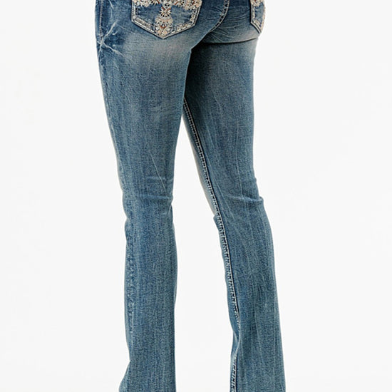 Grace in LA Women's Cross Embellished Bootcut Medium Wash Jeans