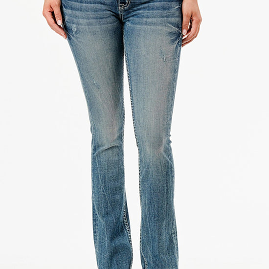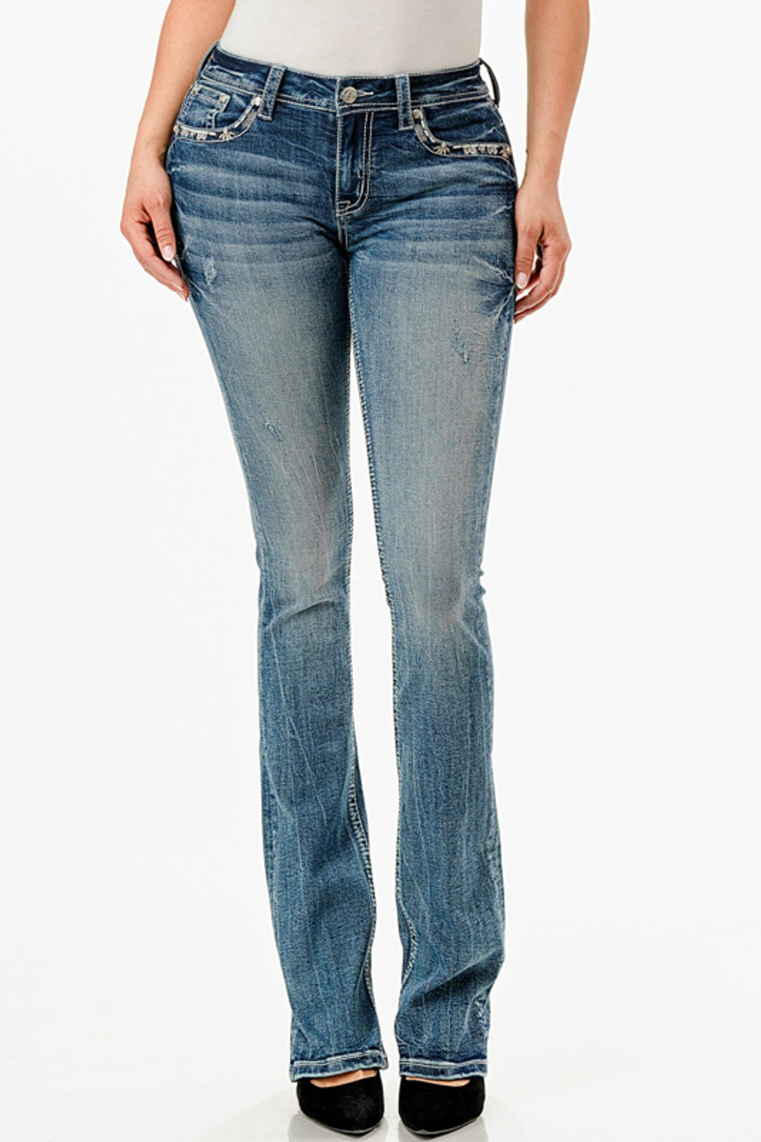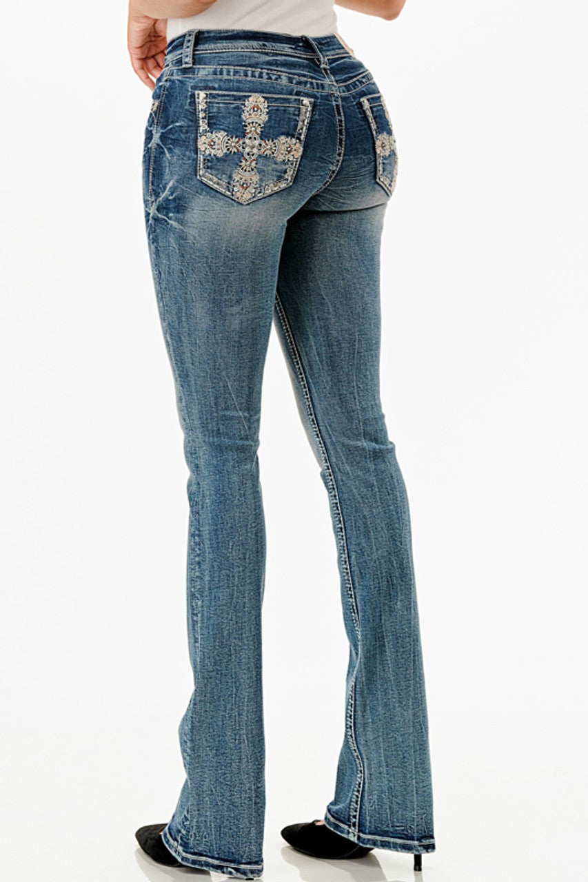 - Style: Cross Embellished Bootcut Medium Wash Denim Jeans