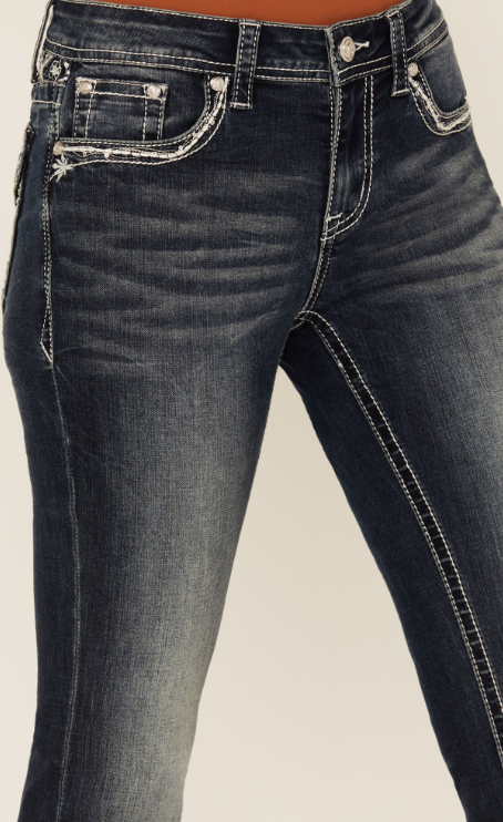 Grace In LA Women's Dark Wash Floral Paisley Embroidered Mid Rise Bootcut Jeans