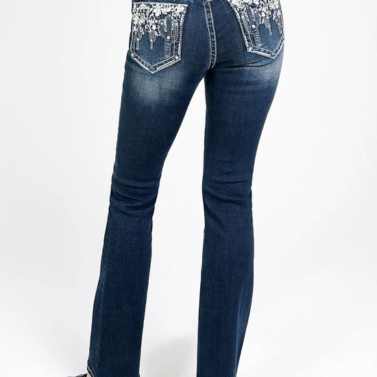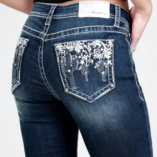 Grace in LA Women's Easy Fit Dark Wash 3D Cactus Mid Rise Bootcut Jeans