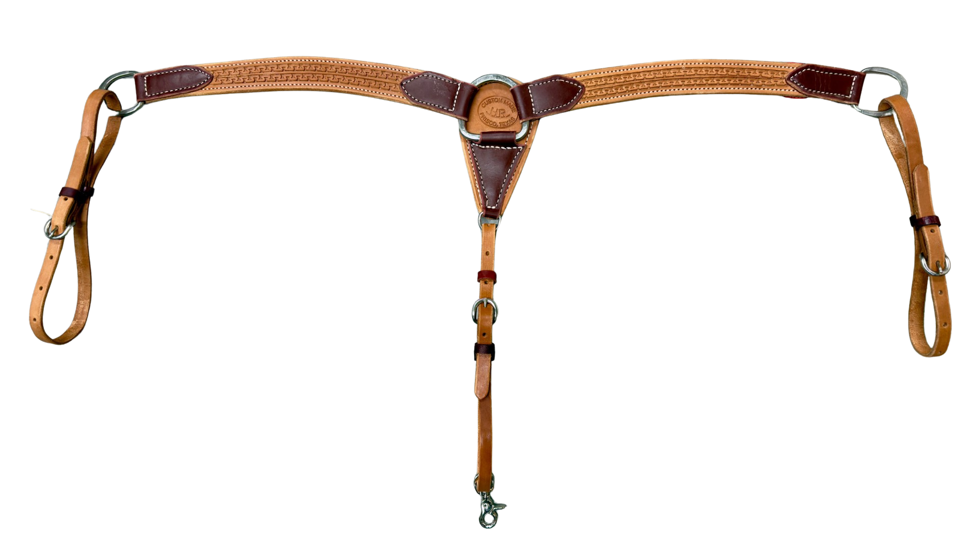 This hand-tooled breast collar combines traditional craftsmanship with practical performance. The 1-1/2" width distributes pressure evenly across your horse's chest, while the running W design keeps your saddle secure during demanding work. Natural leather ages beautifully, developing a rich patina that reflects years of partnership with your horse. Stainless steel hardware ensures lasting durability without rust or corrosion. Built for riders who appreciate quality tack that performs as well as it looks.