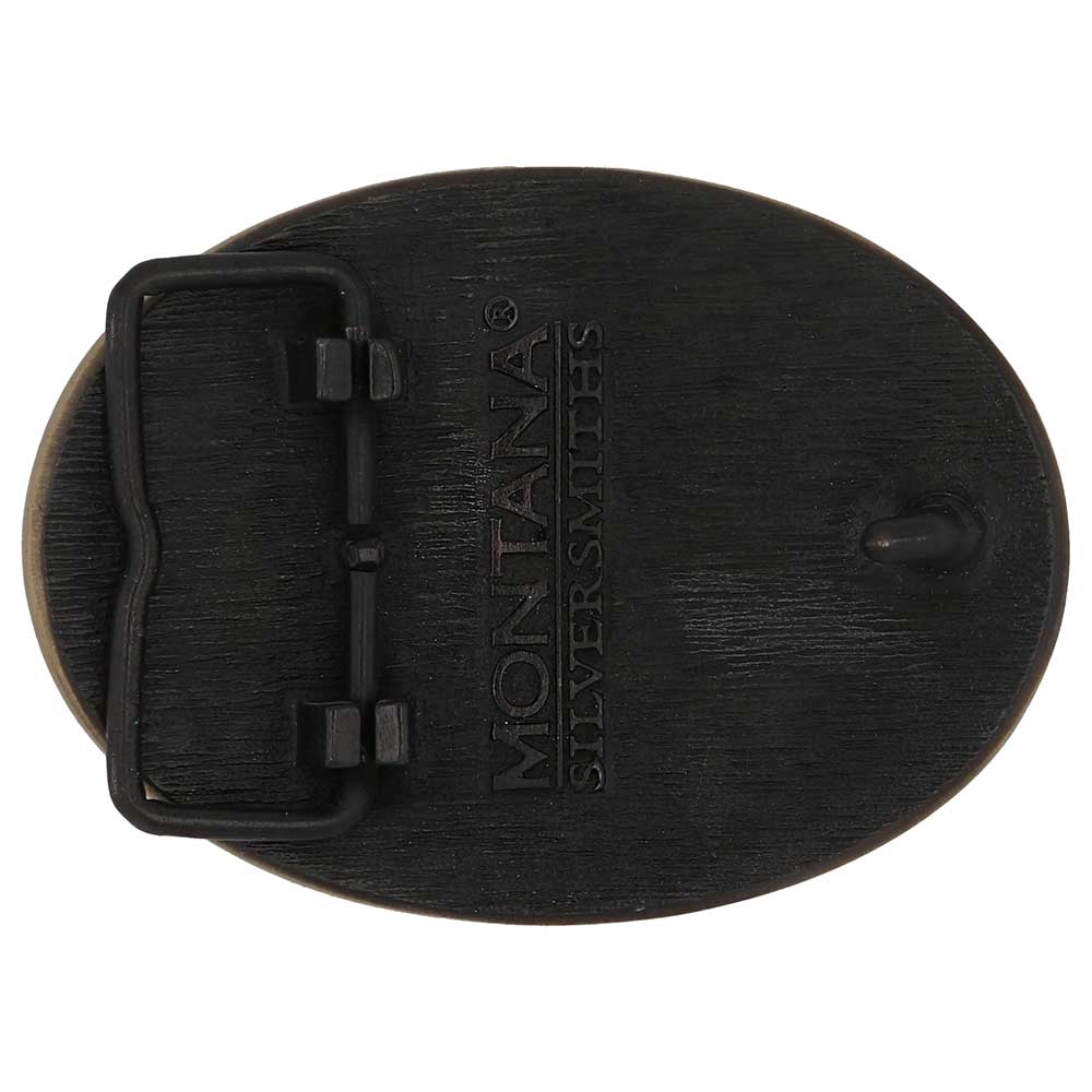 Small, oval cast brass Attitude belt buckle with polished wire trim. Large lettering spelling out Kansas stretches boldly across, surrounded by a set of antiqued figures in celebration of Kansas heritage including farming, stagecoach, buffalo and the state seal. Our cast belt buckles are acid washed to add the dark antiqued patina and hand buffed to bring out the highlights and details. Standard 1.5 inch belt swivel.