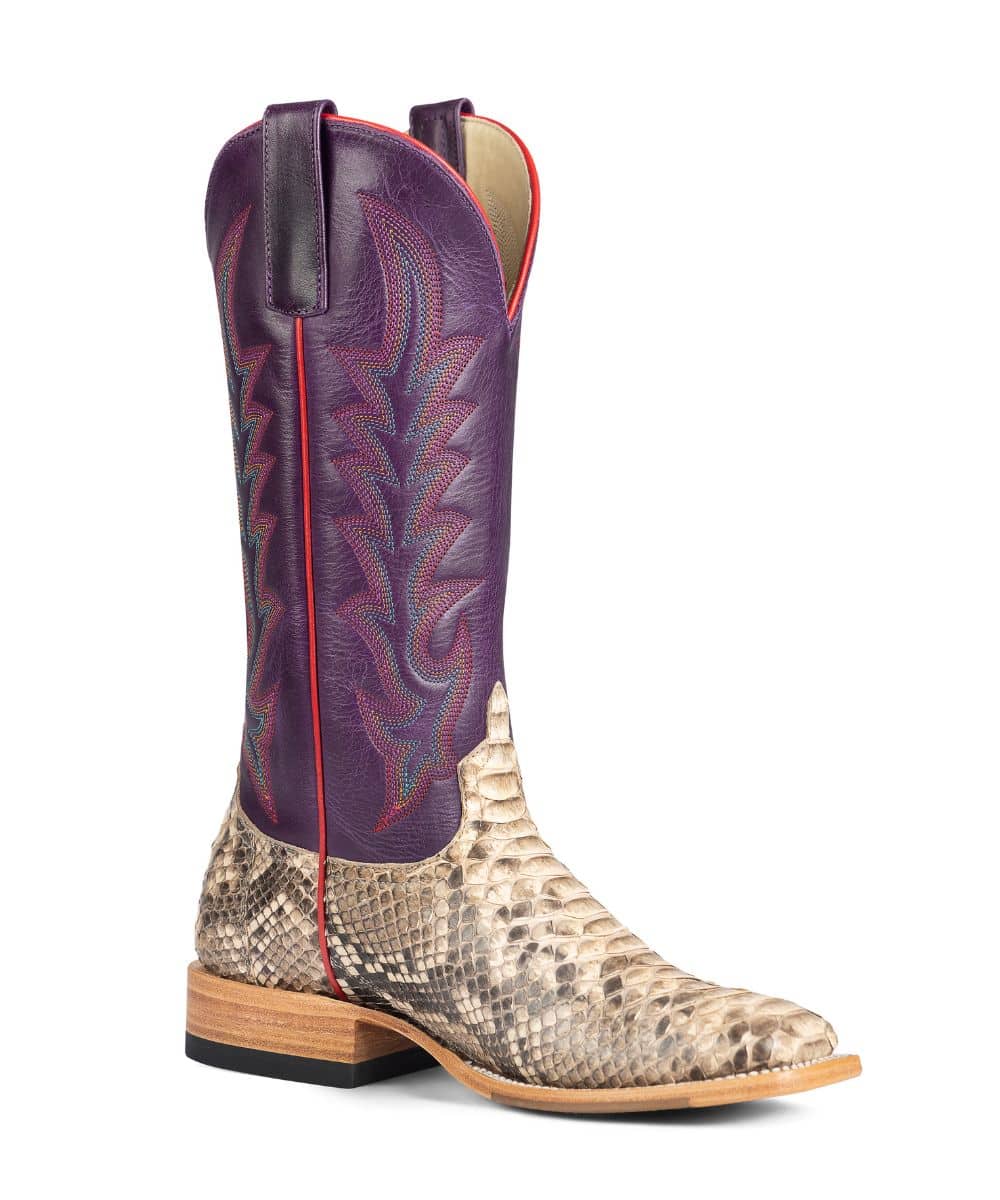 The Macie Bean Women's Mink Python Purple Boots showcase a captivating blend of vamp leather and mink python back cut for unmatched texture and style. Featuring a 13" Purple Texas leather shaft, these boots elevate any outfit with their rich color and sturdy design. The DB toe and classic roper heel provide timeless Western charm and comfortable wear, while the tan hybrid sole ensures excellent durability and traction. Perfect for standing out with effortless confidence, these boots combine fashion and function in every step.