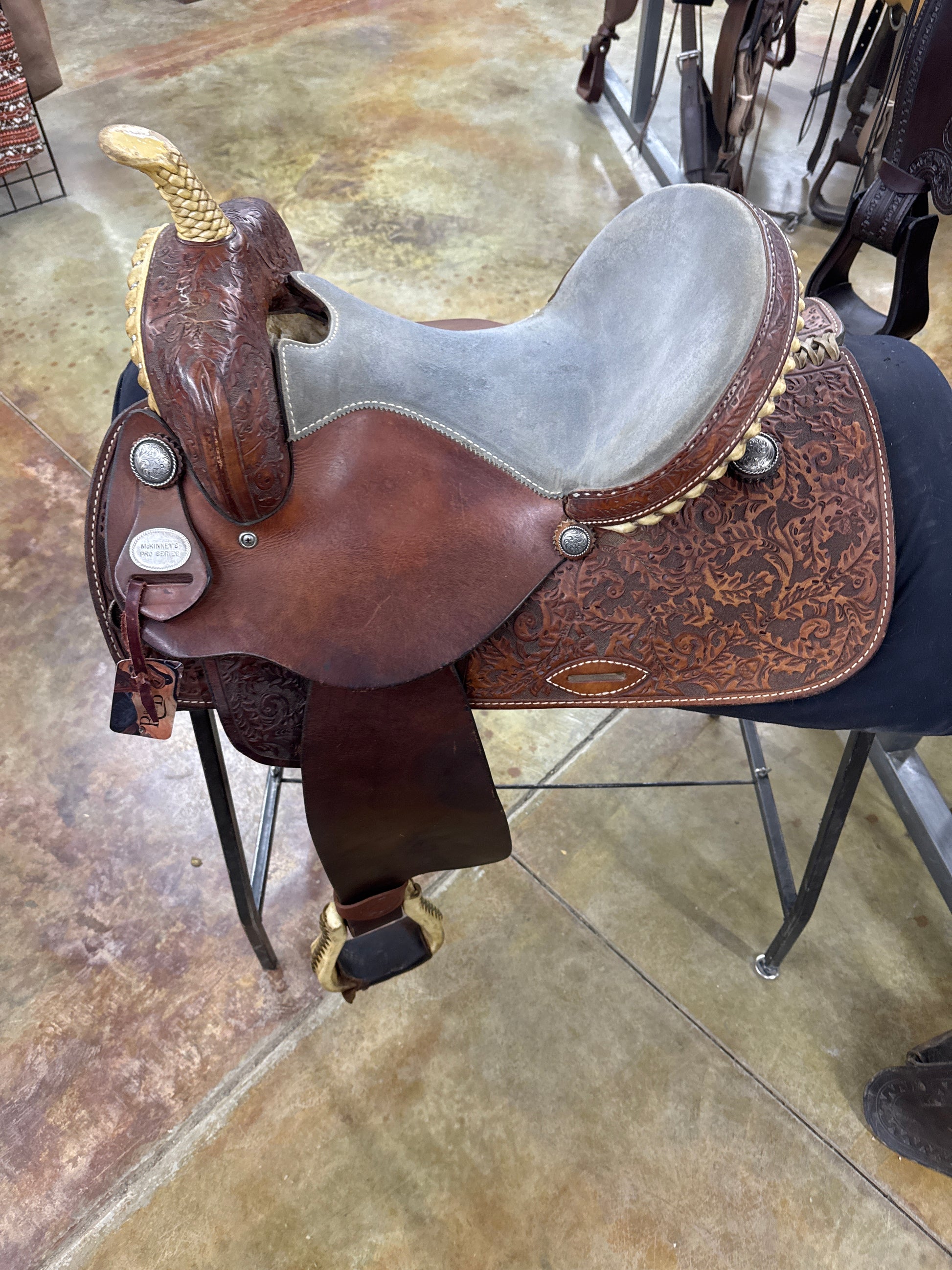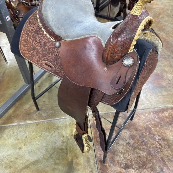1/2 Tool Acorn/Oak, Smoothout Jockey and Fender, Suede Seat, Rawhide Silver Laced Cantle and Swell, Rawhide Braided Horn, Rawhide Covered Stirrups