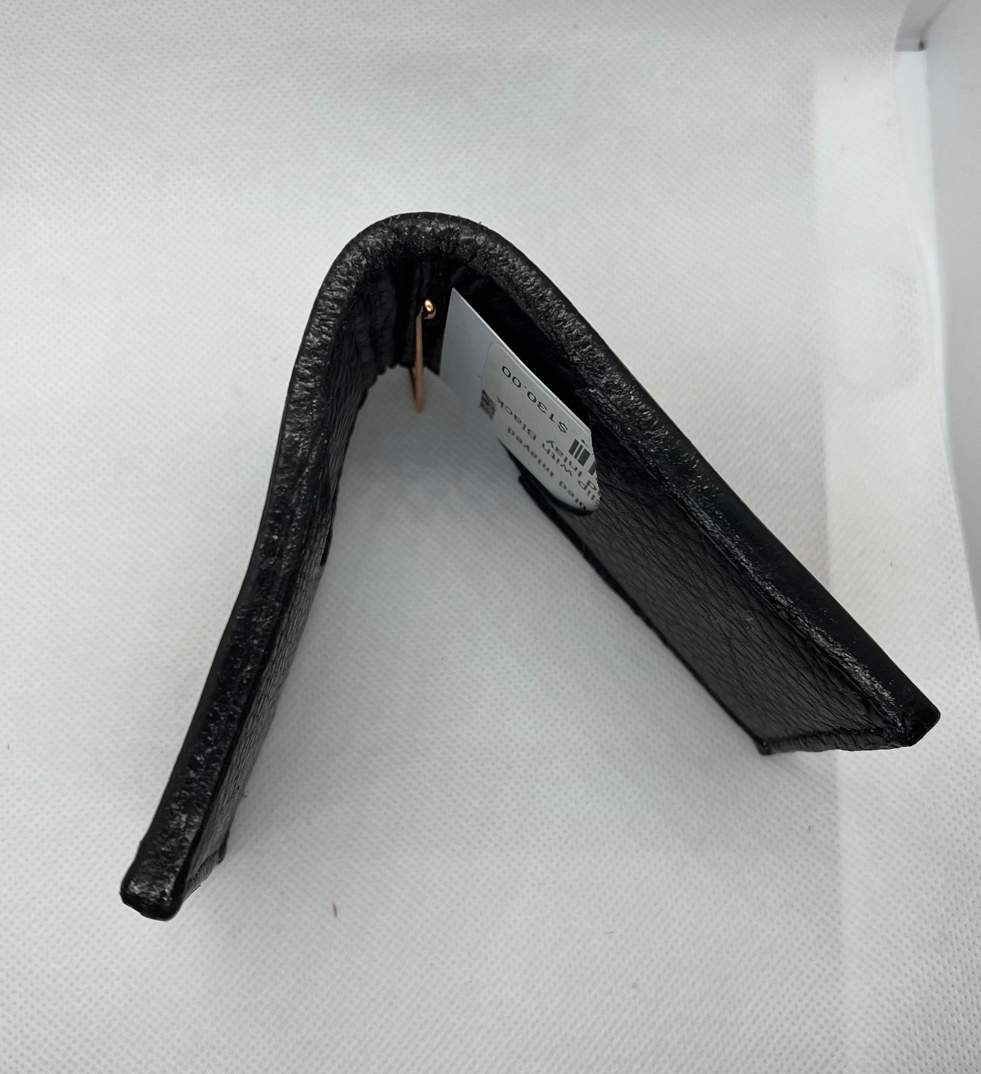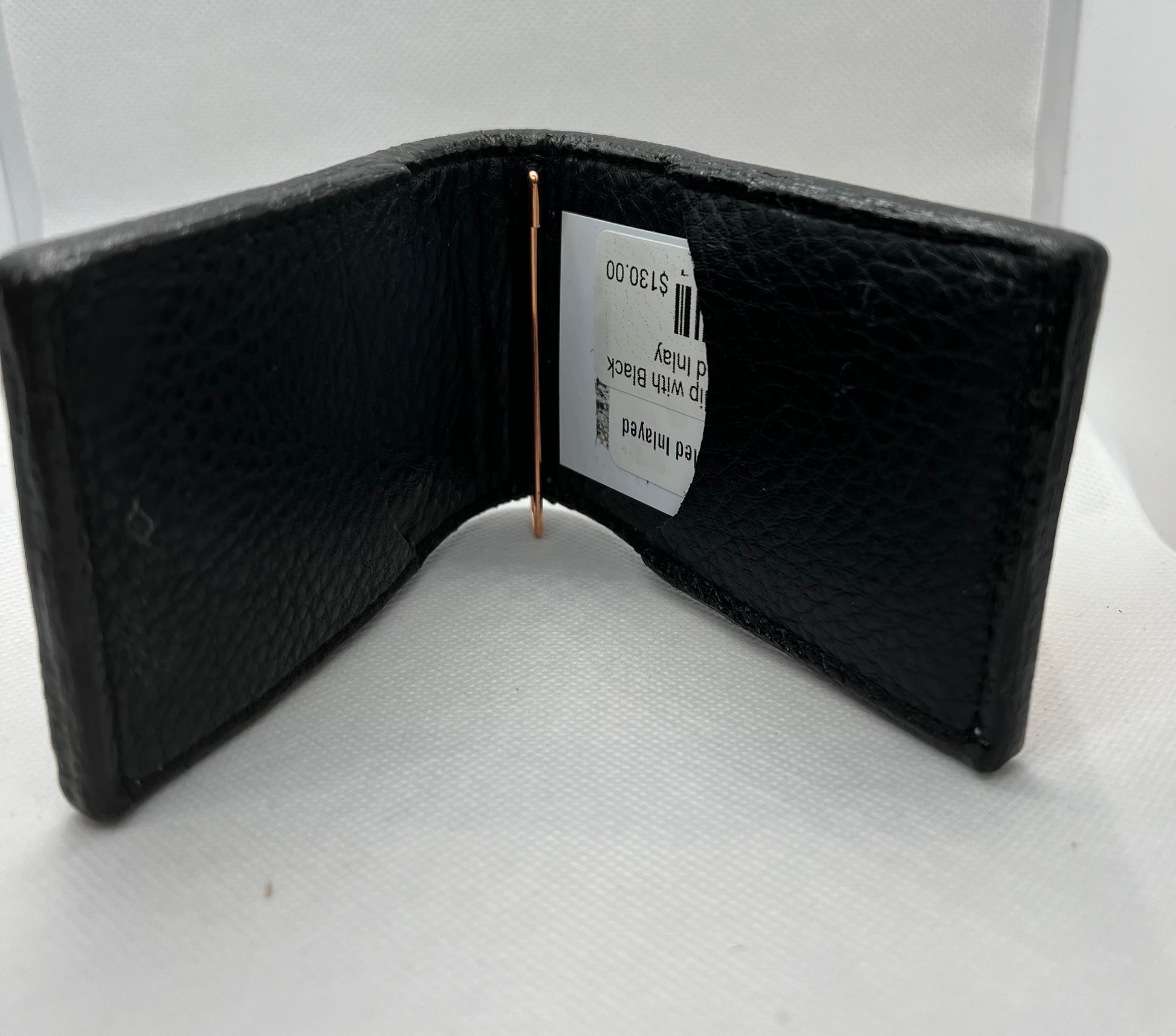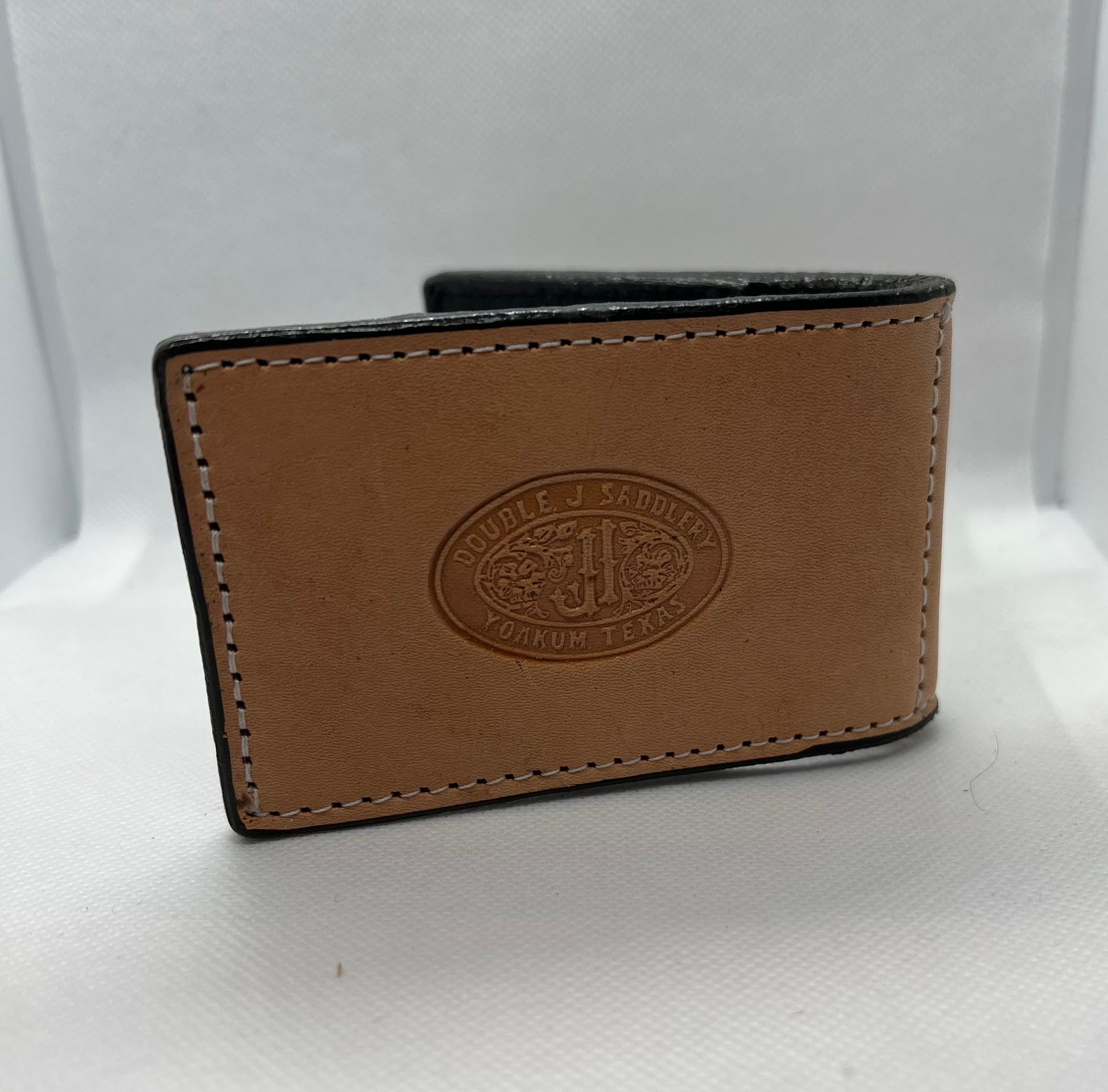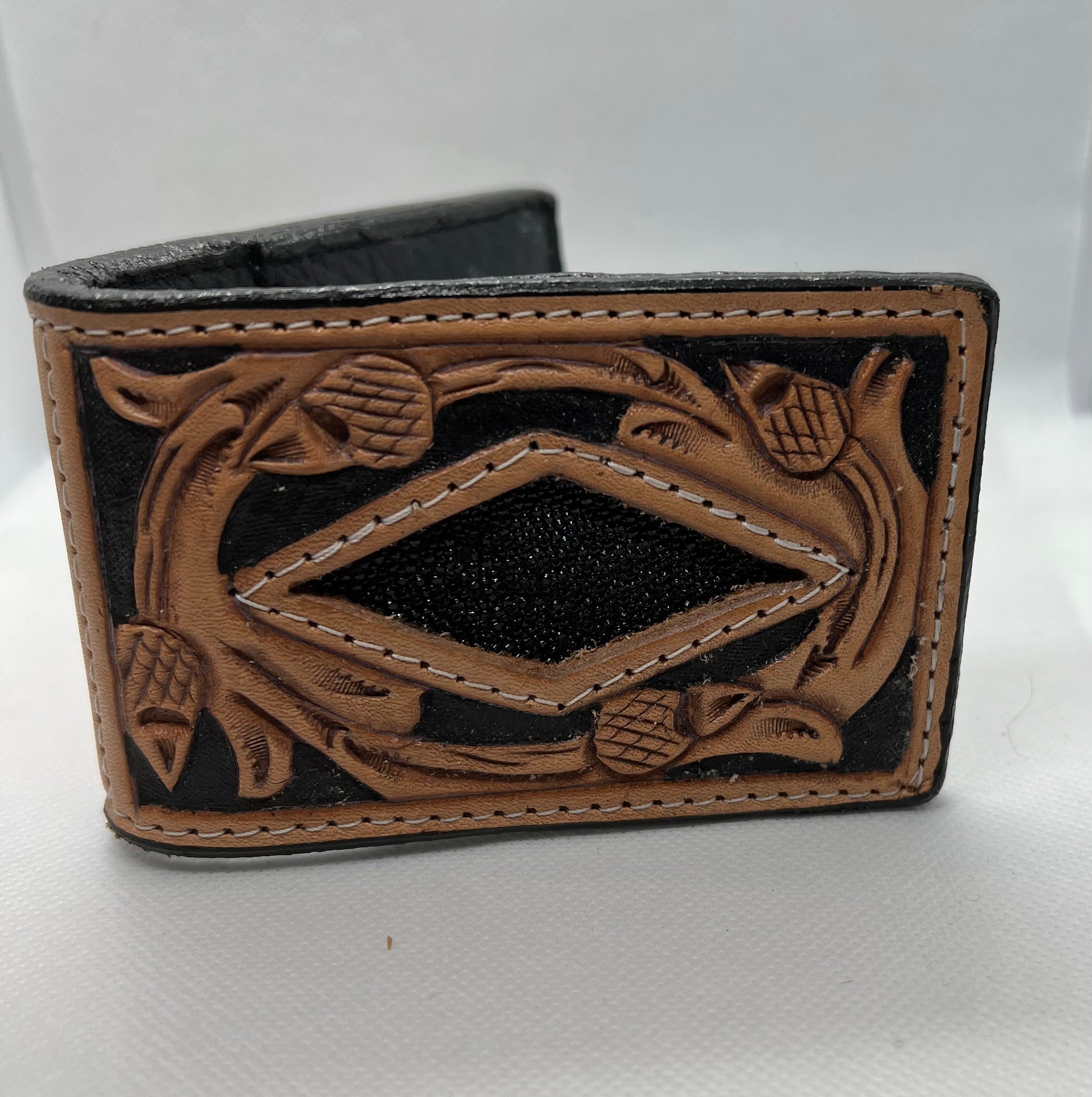 Hand Tooled acorn oak with black dyed background and stingray inlaly. It has two pockets on the inside to hold credit cards, etc, and a money clip to secure cash.